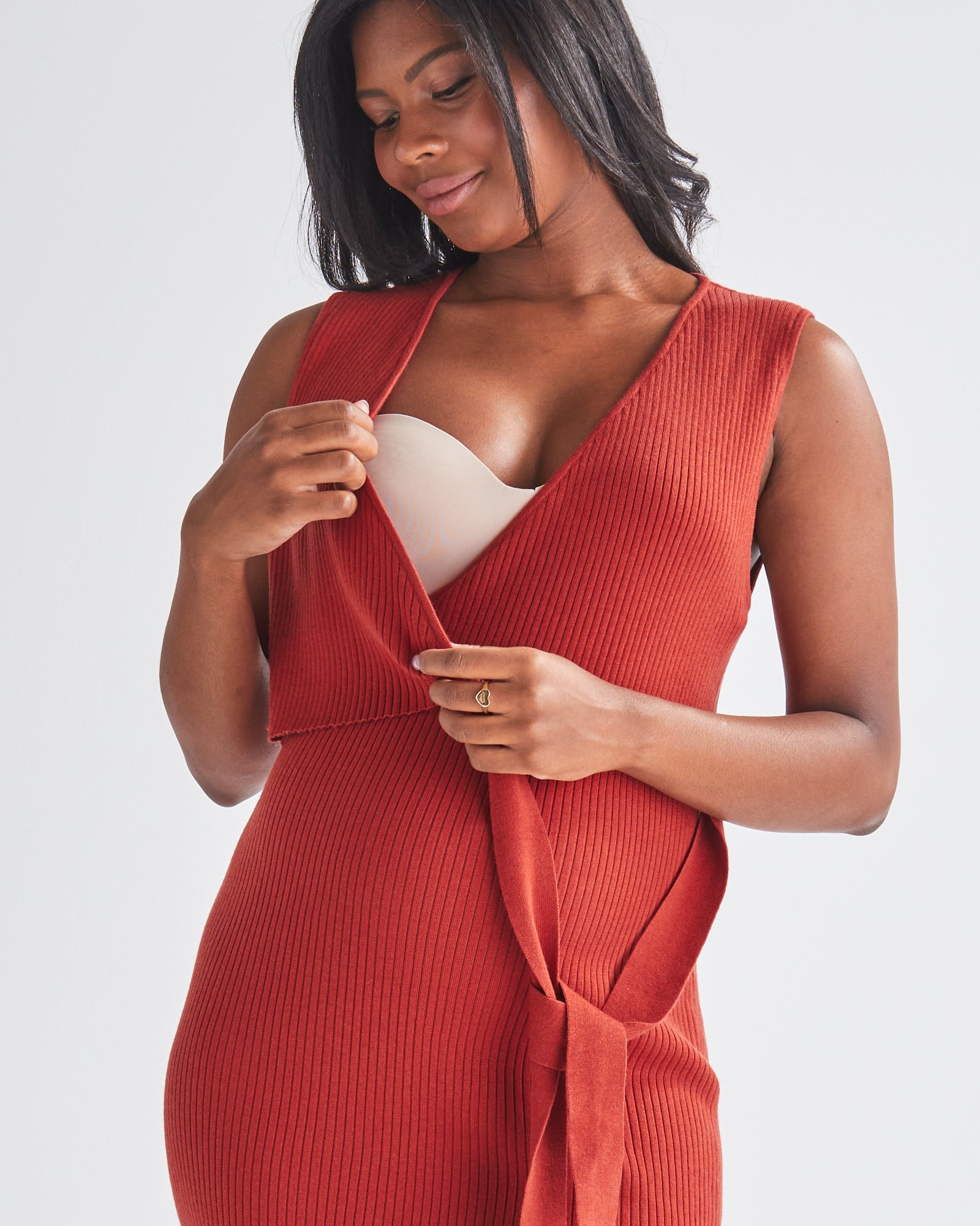 Angel Maternity's fitted knitted dress is perfect stapler, it drapes effortlessly over your curves and offers plenty of stretch for every stage of pregnancy. With an elegant adjustable tie that will grow with you throughout your pregnancy. It is also breastfeeding friendly.