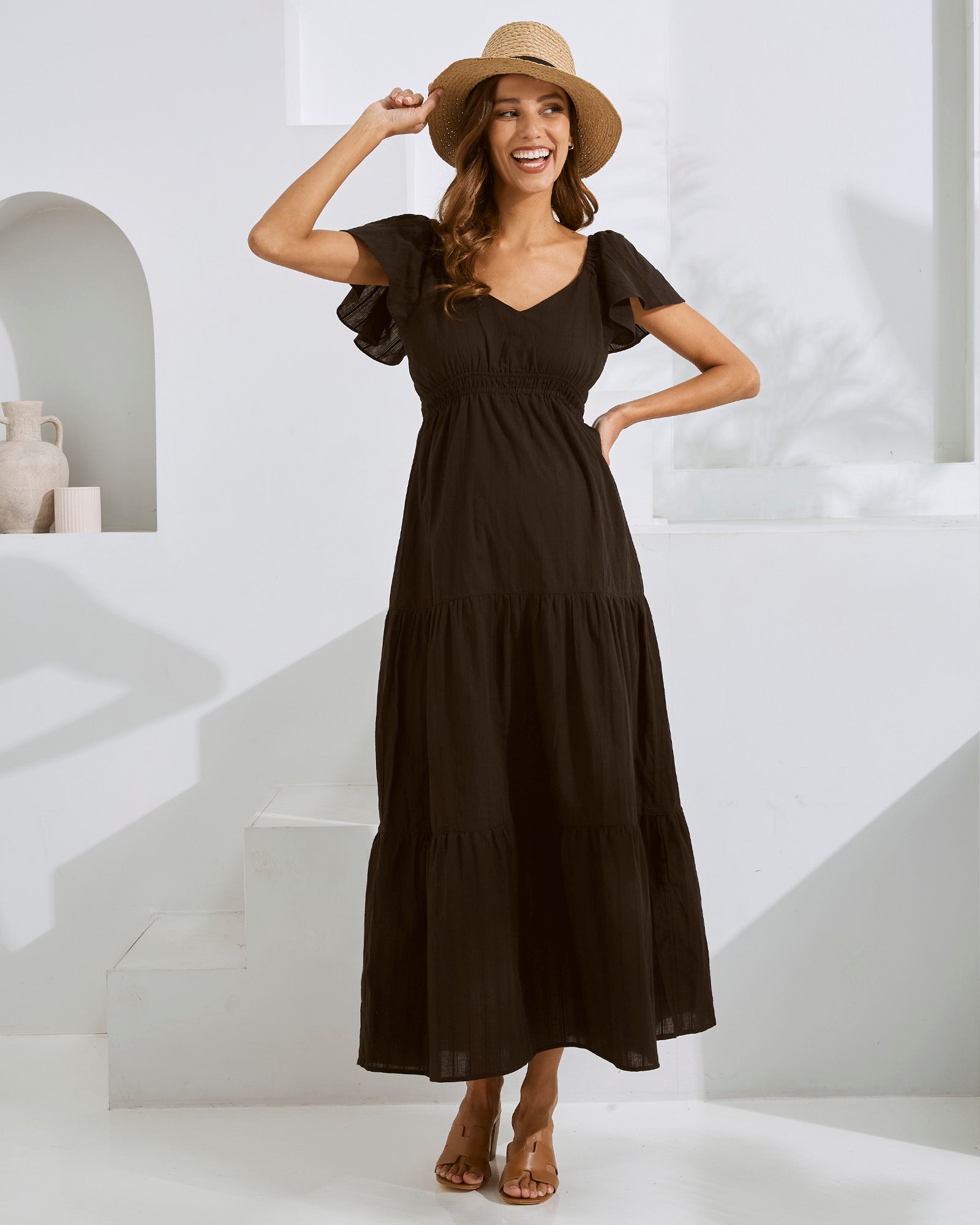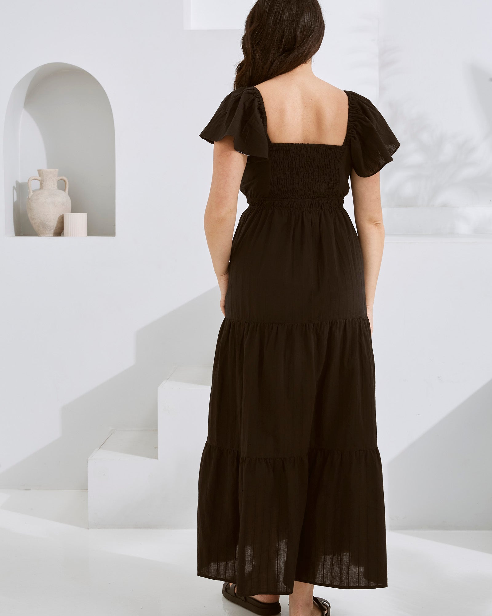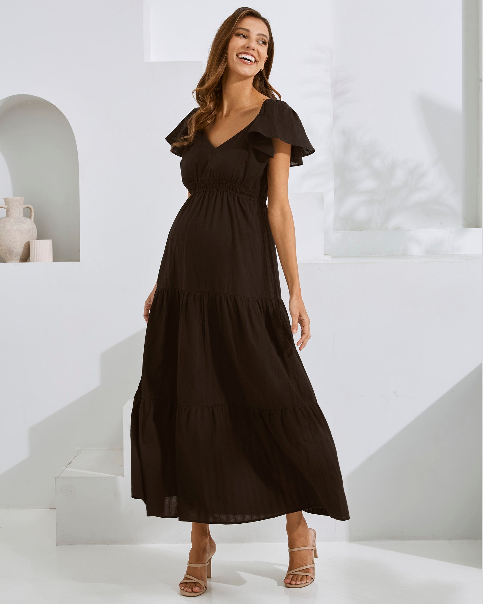 This elegant black cotton maternity dress is perfect for any occasion. Designed with comfort and style in mind, the Serena dress features a flattering empire waist and flowy skirt that accentuates your growing belly while providing effortless movement. The soft, textured fabric ensures a light and airy feel, making it an ideal choice for a relaxed outdoor baby shower or casual gathering.
