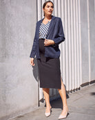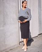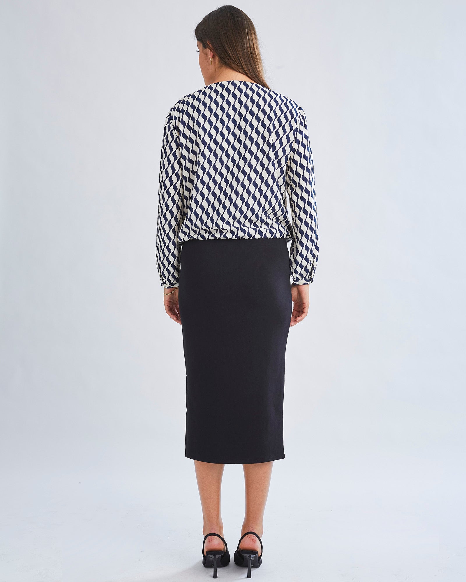 This chic blouse features a geometric wave pattern in a timeless blue and white combo. With a classic V-neck and long sleeves, it offers a perfect blend of style and practicality. The lightweight, soft fabric ensures all-day comfort, making it ideal for working moms. Pair it with skirts or trousers to add confidence and professionalism to your look.