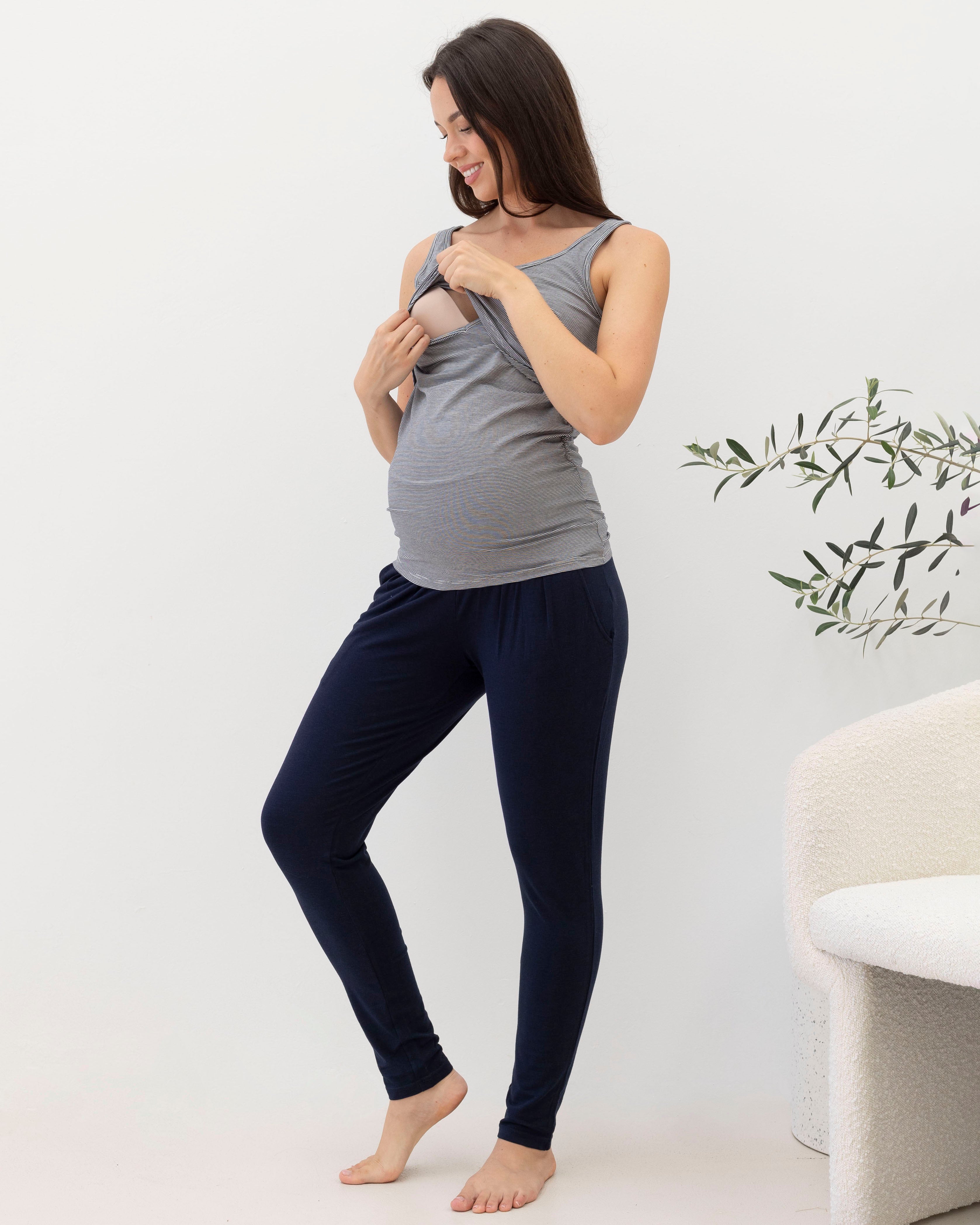 The sleeveless nursing top is light and breathable, with easy pull-up nursing access. Throw on the waterfall cardigan for added warmth and coverage. Paired with our comfortable maternity-friendly lounge style pants, which feature a wide, comfortable and stretchy waistband that can be worn over your belly and will grow with you for a perfect fit. These are essential for your maternity wardrobe!