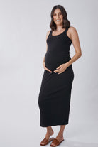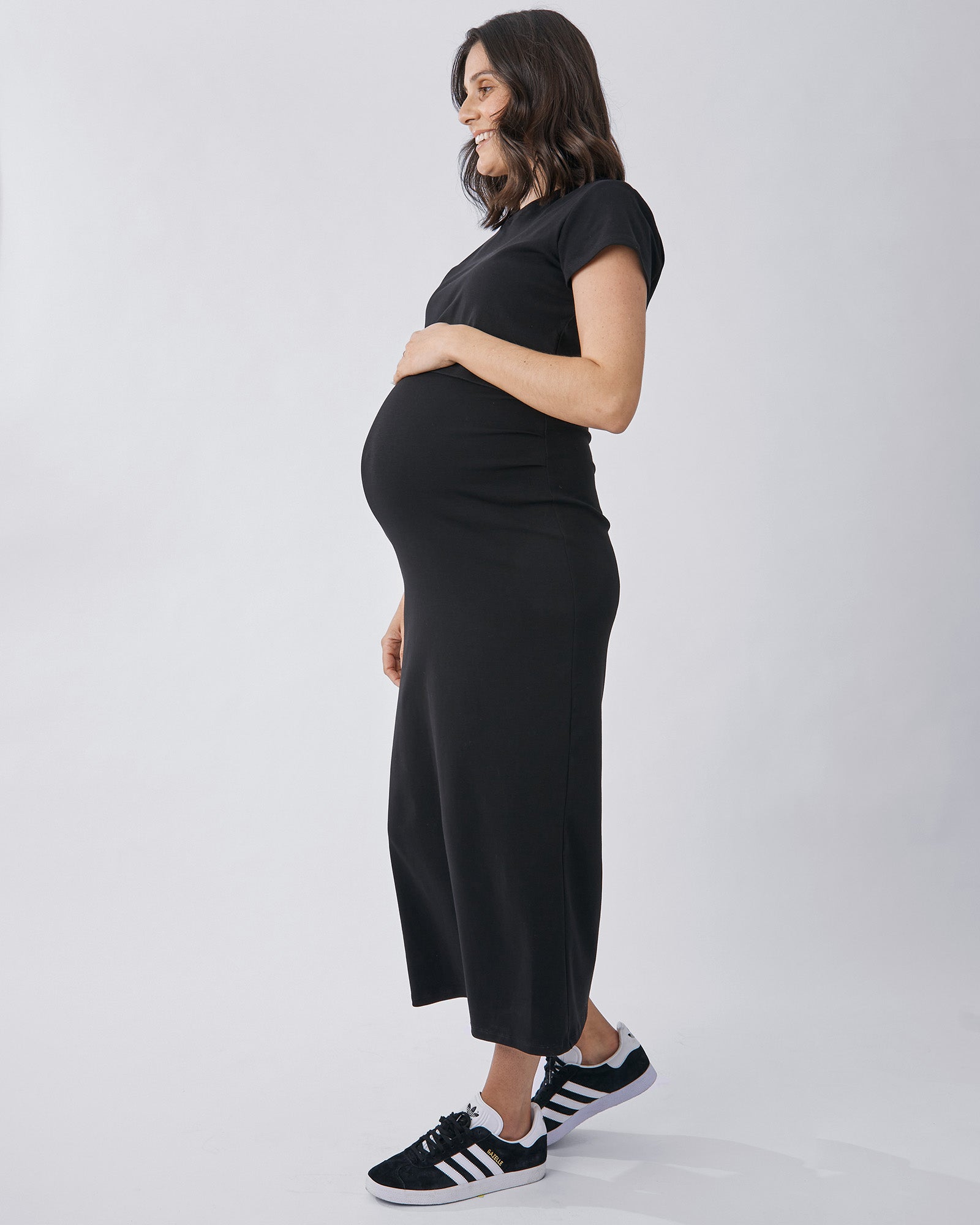 Our Maternity ribbed midi dress with short sleeve tee in sleek black. This elegant two-piece set is crafted from cotton stretch fabric, designed to fit and flatter your growing bump. Paired with a matching short sleeve top, this set offers versatility and ease for both casual and dressy looks. This set ensures breathability and a soft touch against your skin. Elevate your maternity wardrobe with this stylish and timeless ensemble.