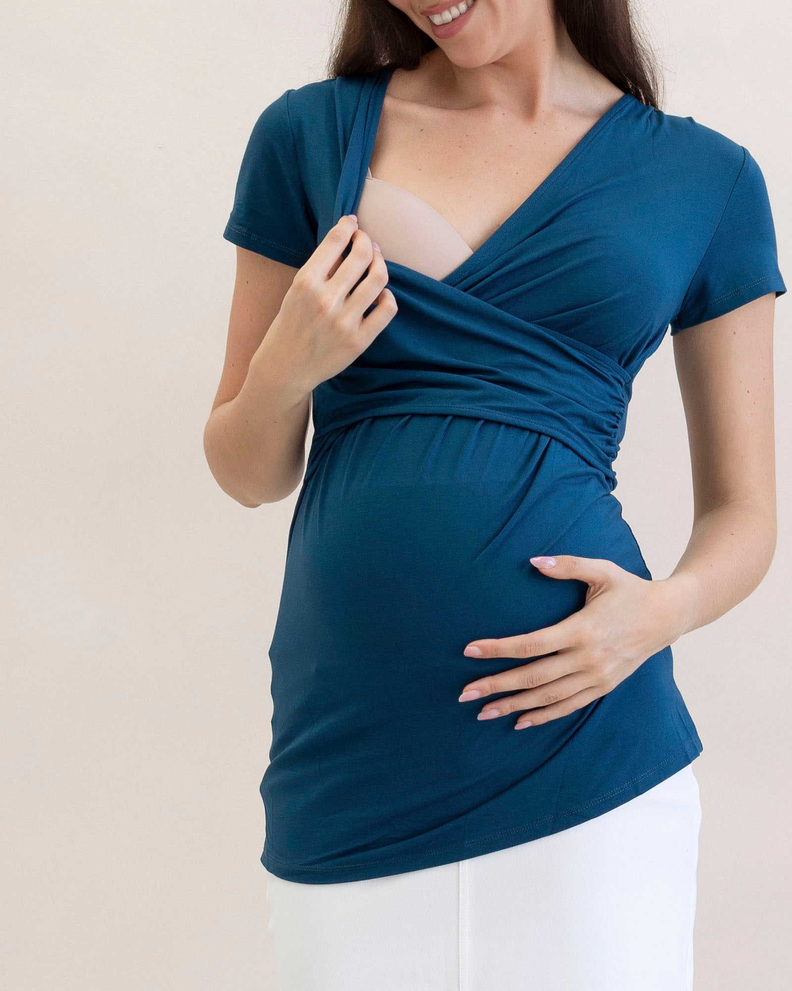 This cross over fitted maternity teal blue top is easy to wear throughout your maternity and after for nursing. Short sleeve length perfect for the hot weather days.
