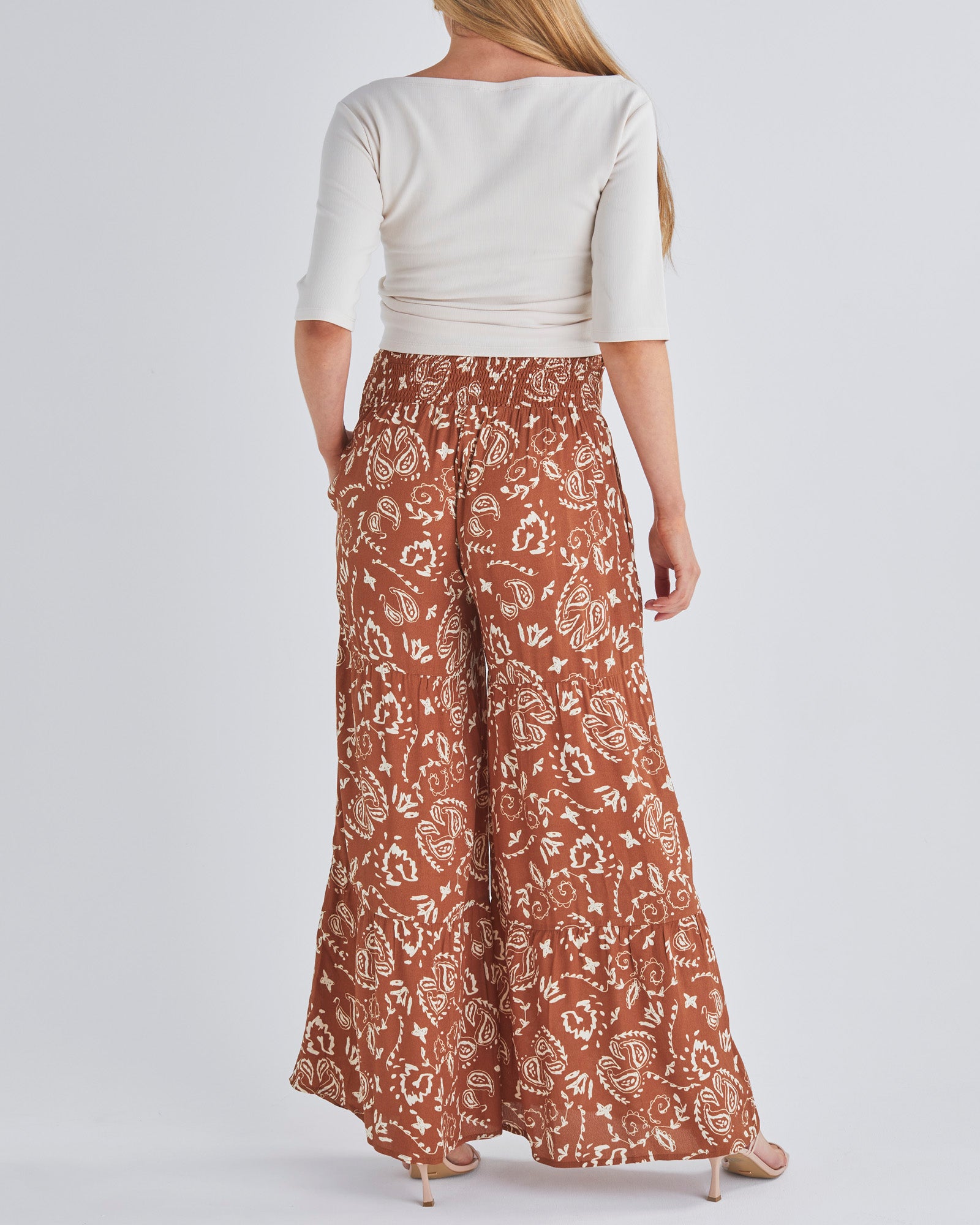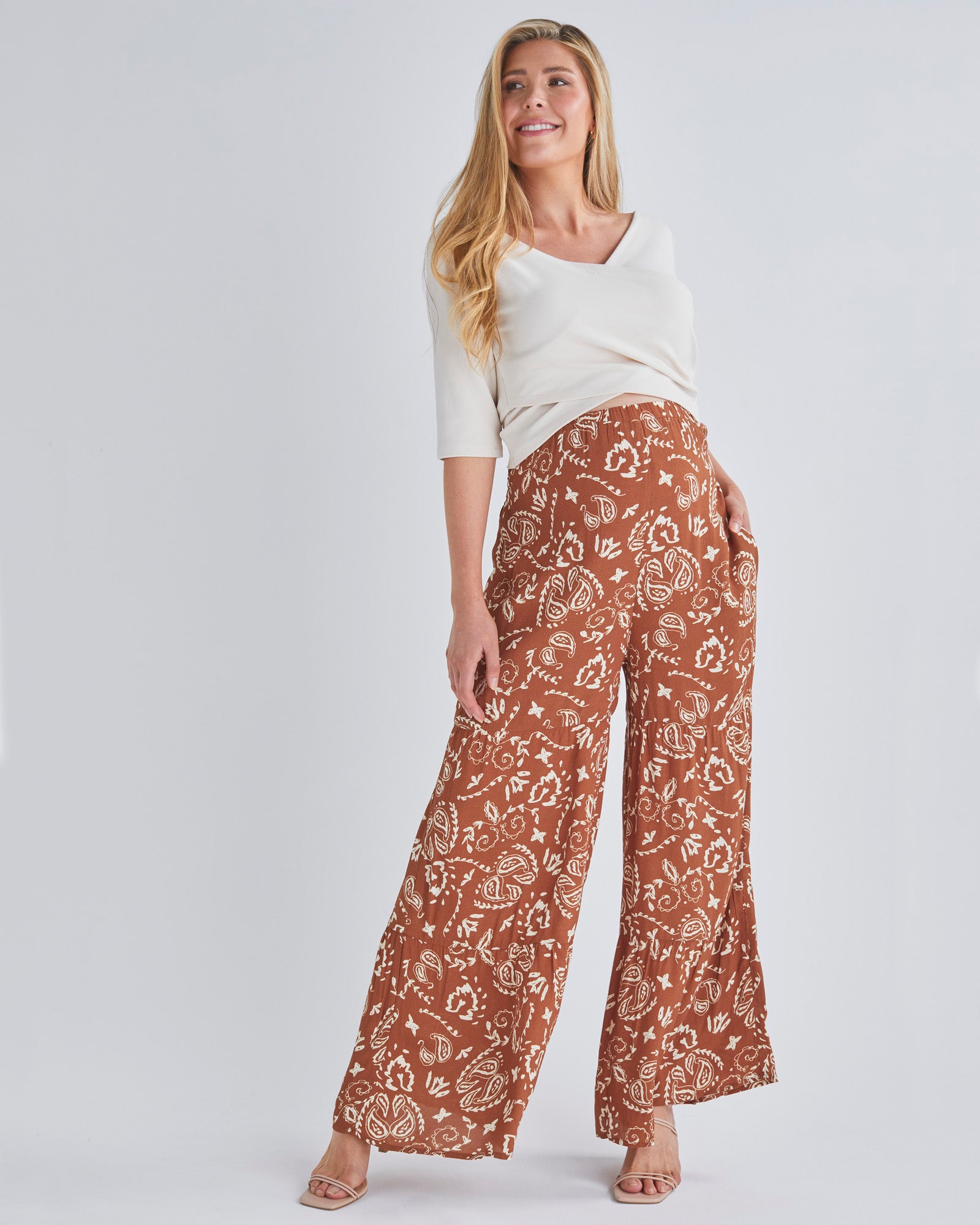 Our newest paisley print pant, the wide leg Maternity Ruffled Pants are our latest creation. Once you try them on you will know why- so soft and comfortable!! You will want multiple pairs. The wide leg provides a fashionable, yet roomy pant for stylish comfort.