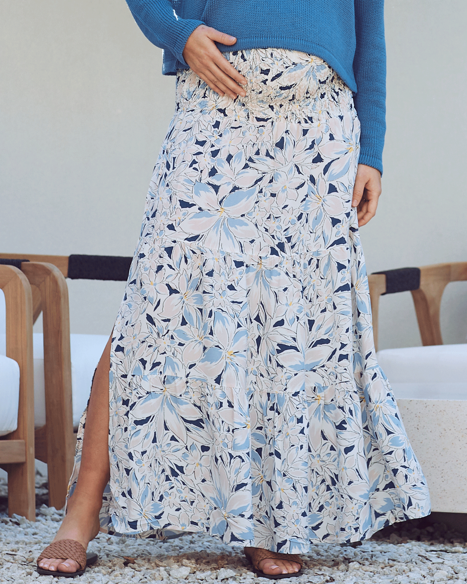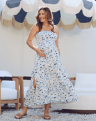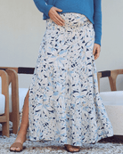 Ellie Maternity 2-in-1 Shirred Maxi Dress/Skirt in White/ Navy Floral Print