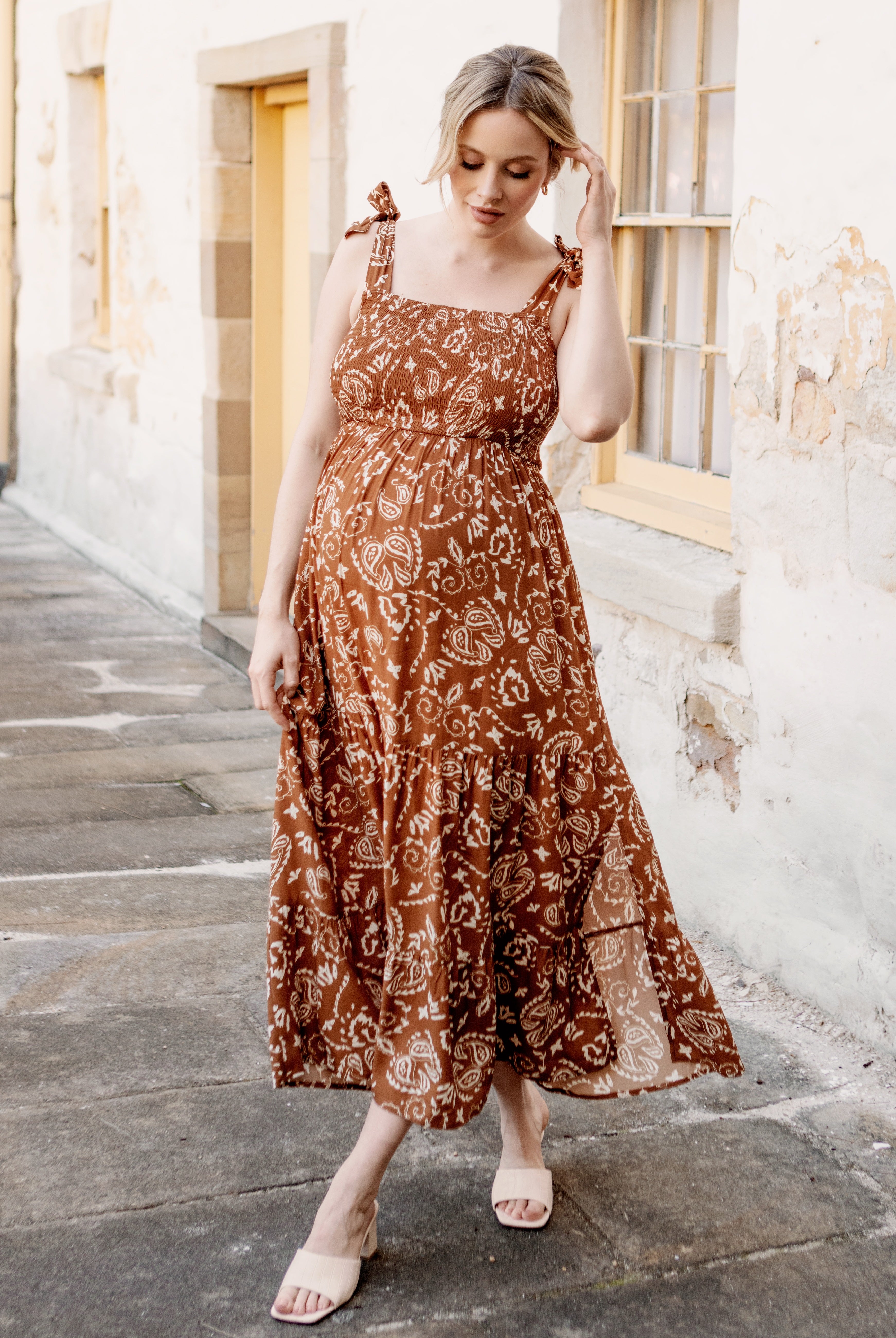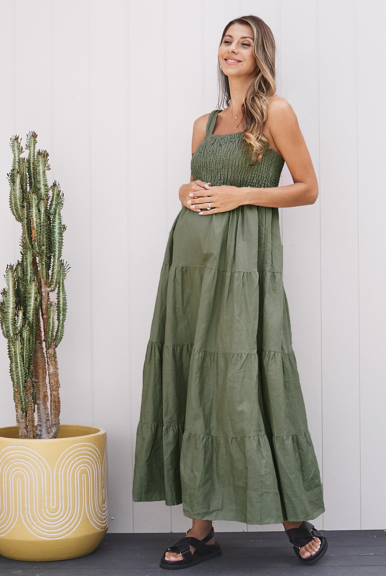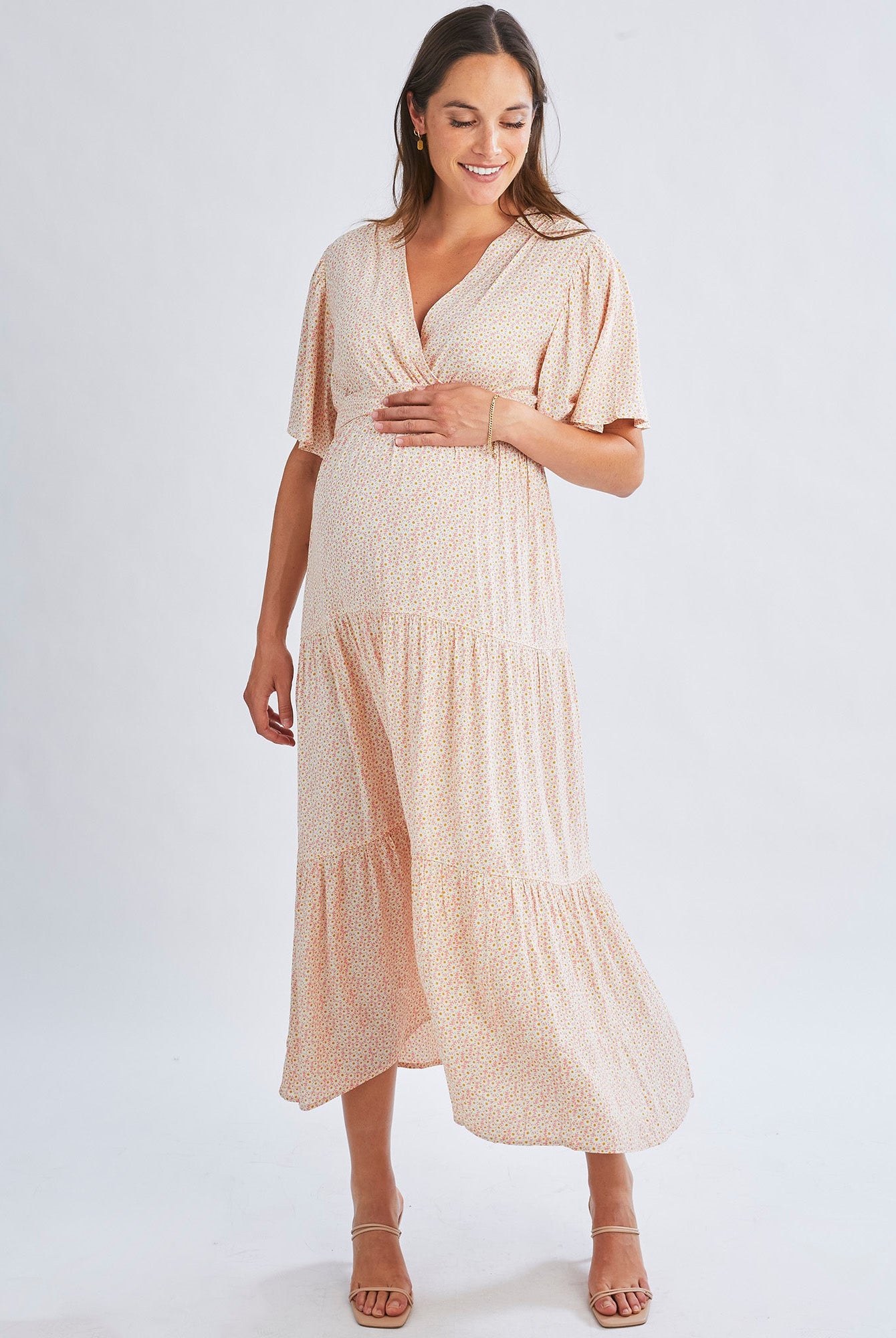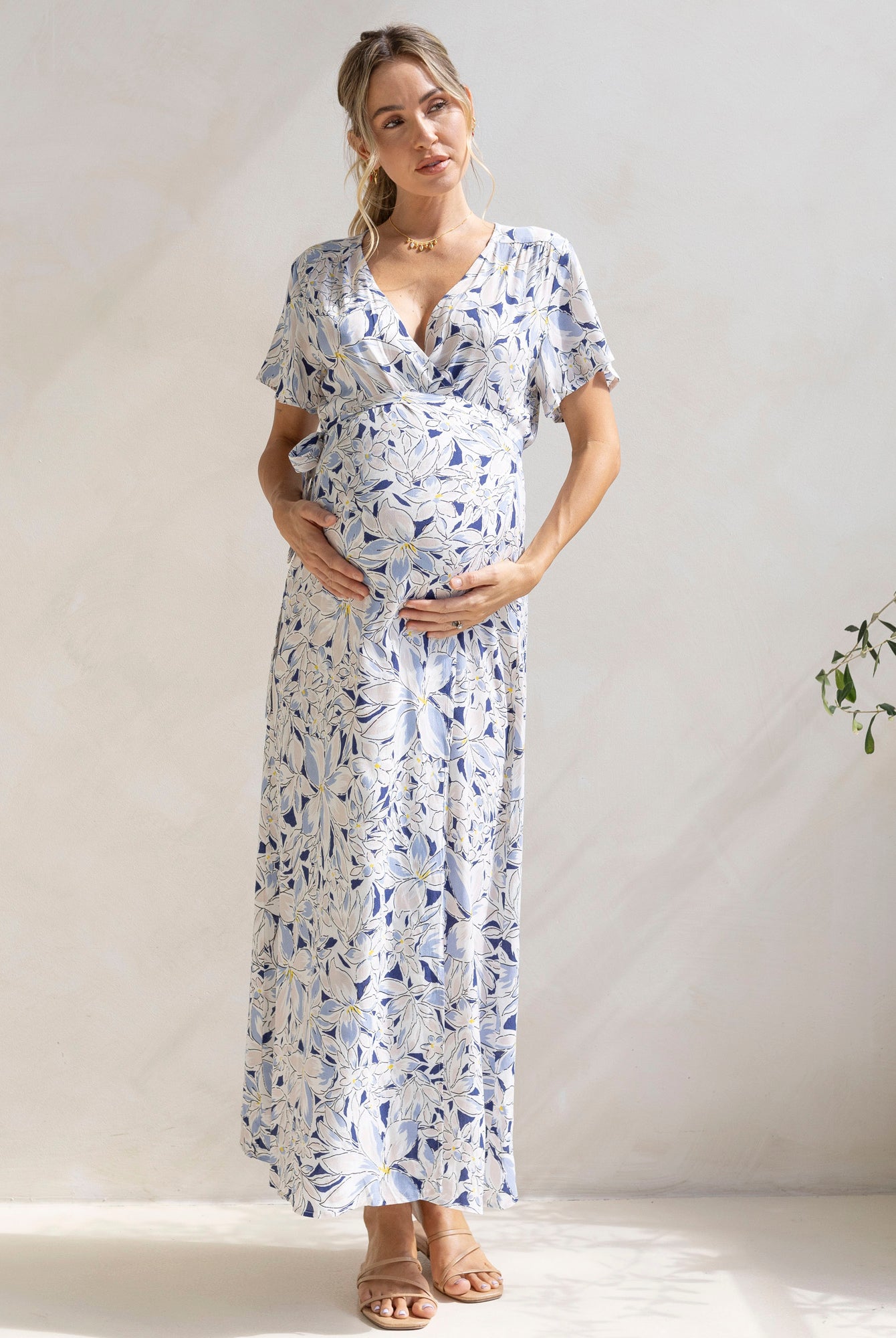 Wear a maternity maxi dress barefoot for a bohemian-inspired look.