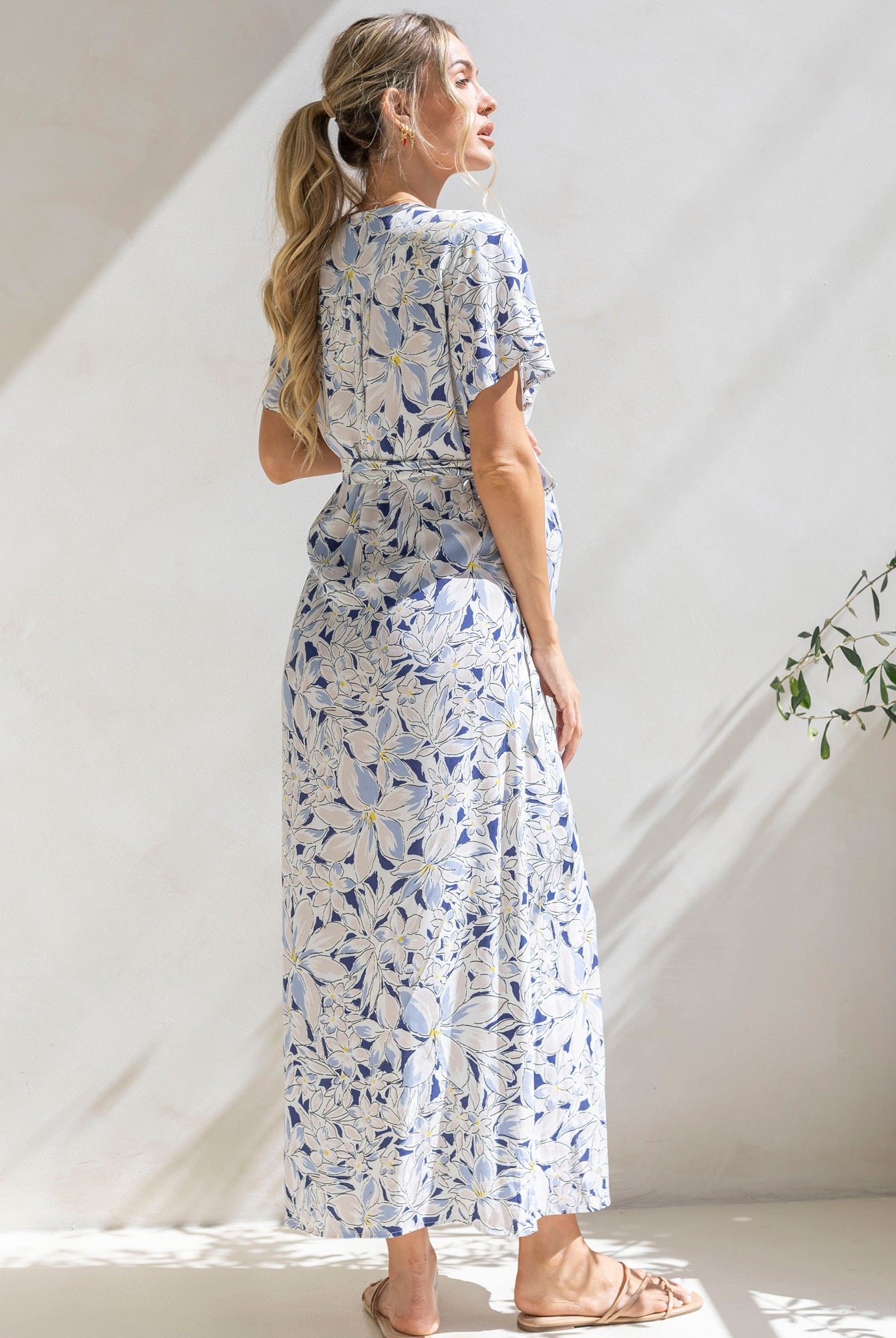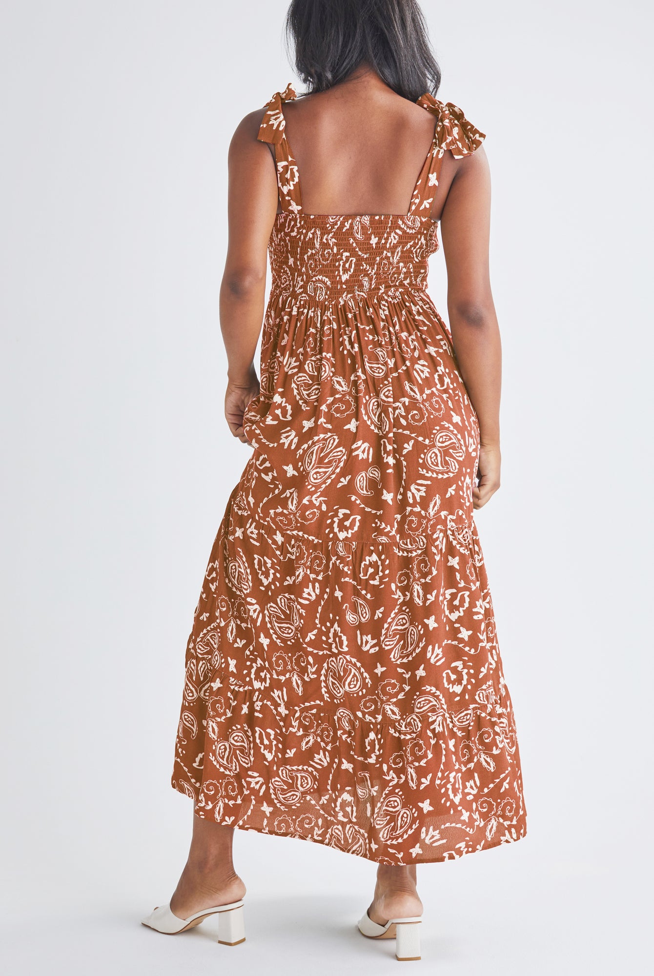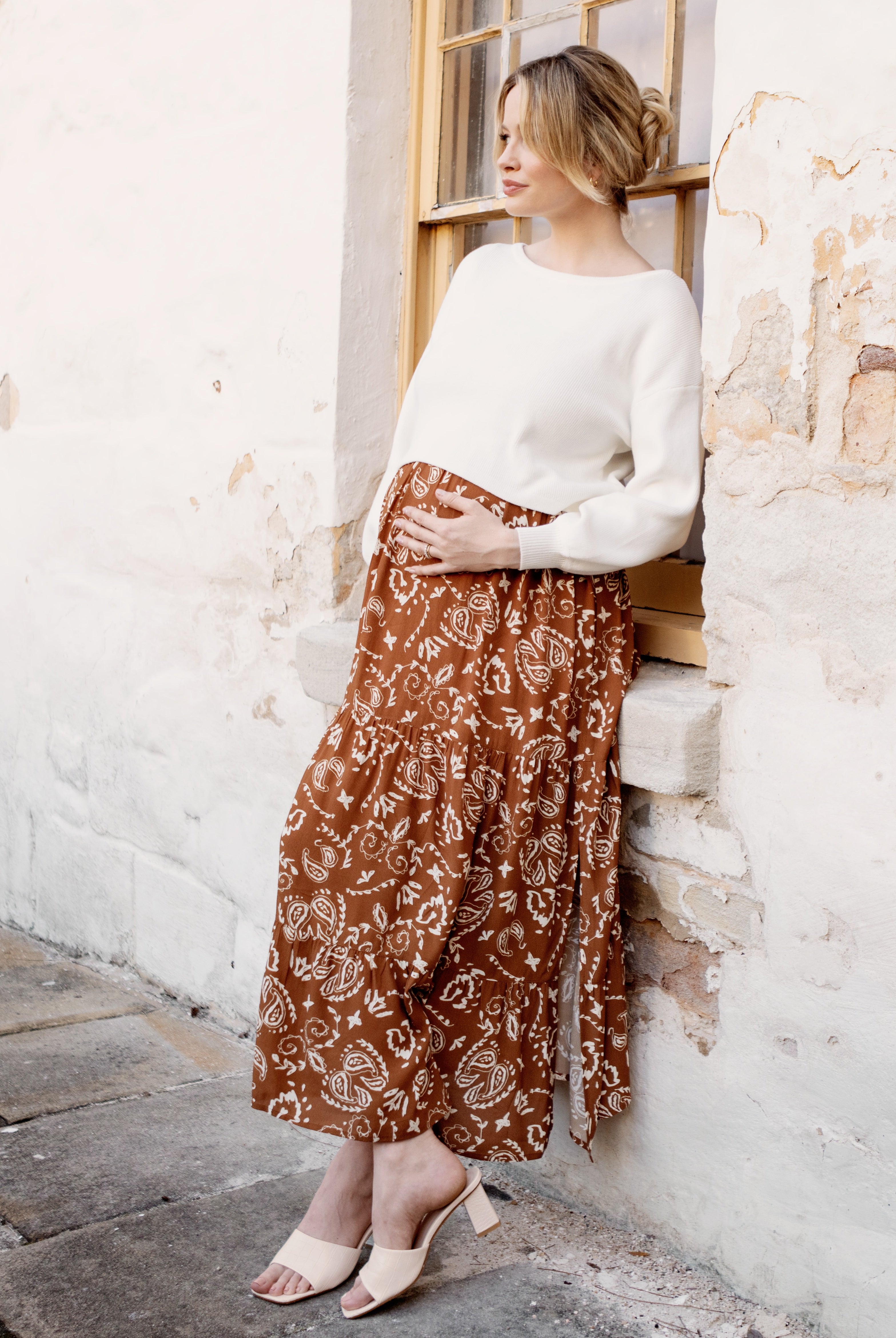 Wear a maternity maxi dress barefoot for a bohemian-inspired look.