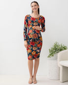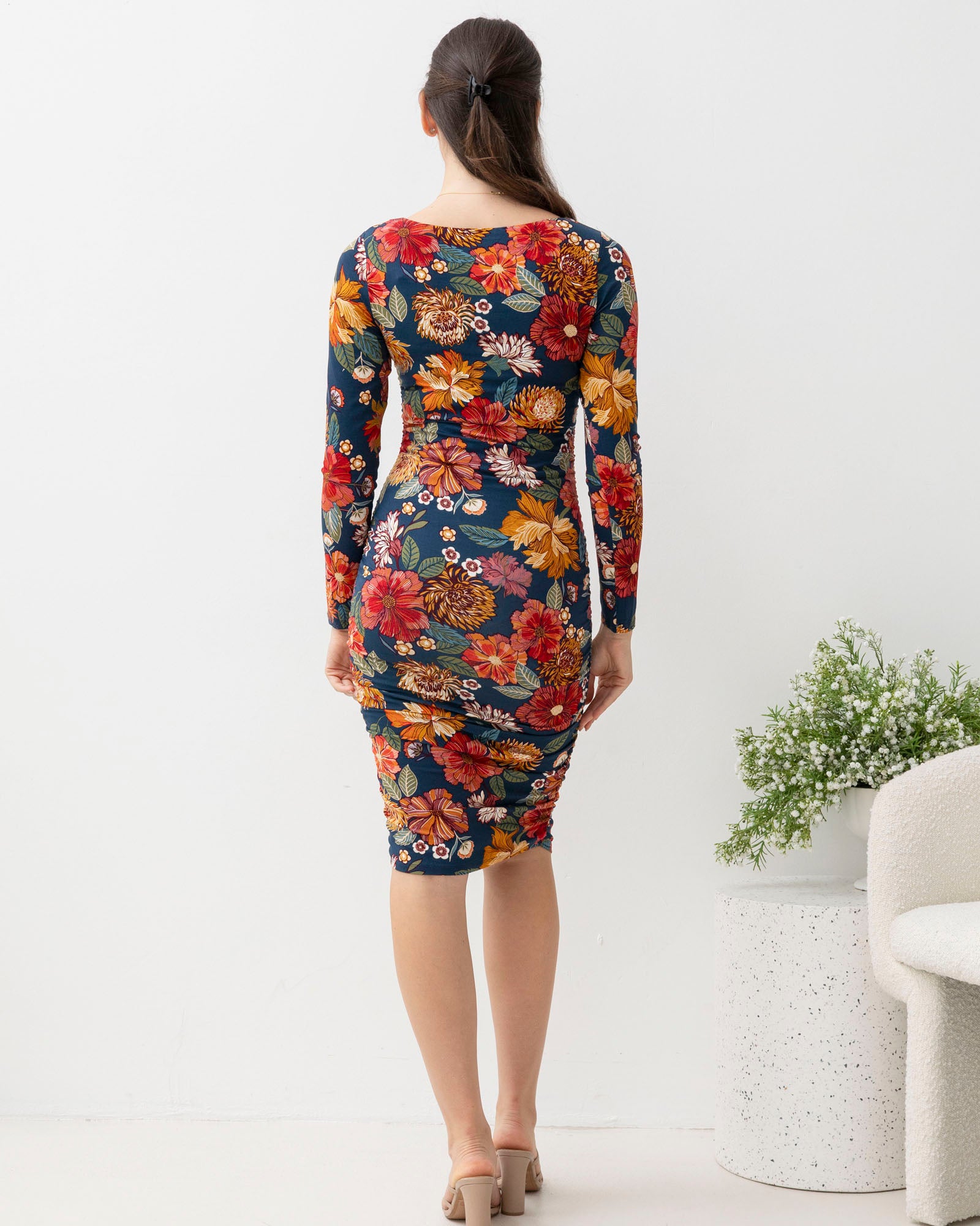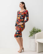 Long Sleeve Red Floral Print Maternity Bodycon Dress