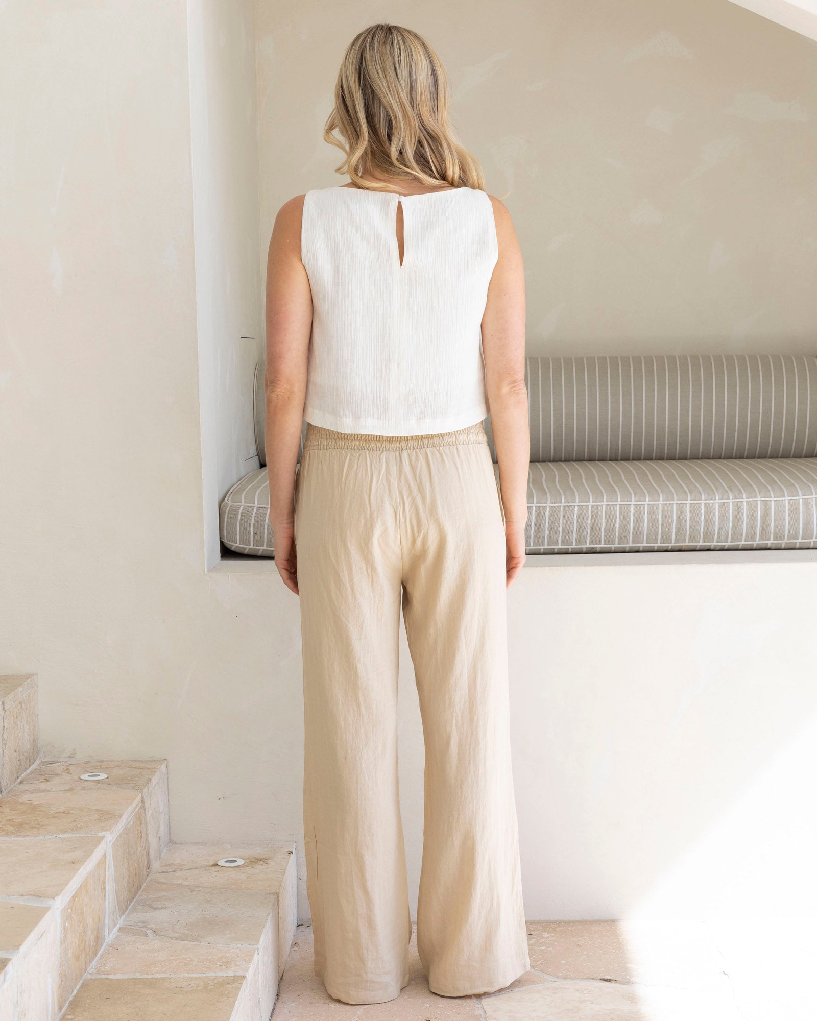 We all love these soft sand colour linen/rayon maternity pants with comfortable ruched waist band, wide leg and drawstring. Stylish, soft and comfortable, you will enjoy wearing them during your pregnancy. Pair with our matching linen top to complete the look.