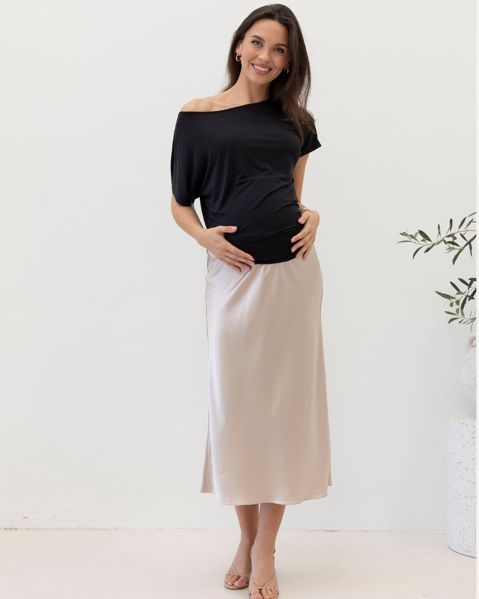 Effortless elegance meets everyday comfort in the Angel Maternity High Waist Deluxe Satin Skirt. Designed in a flattering midi length, this dressy maternity skirt is bias-cut to drape beautifully over the body, creating a soft A-line silhouette that moves with you through every stage of pregnancy.