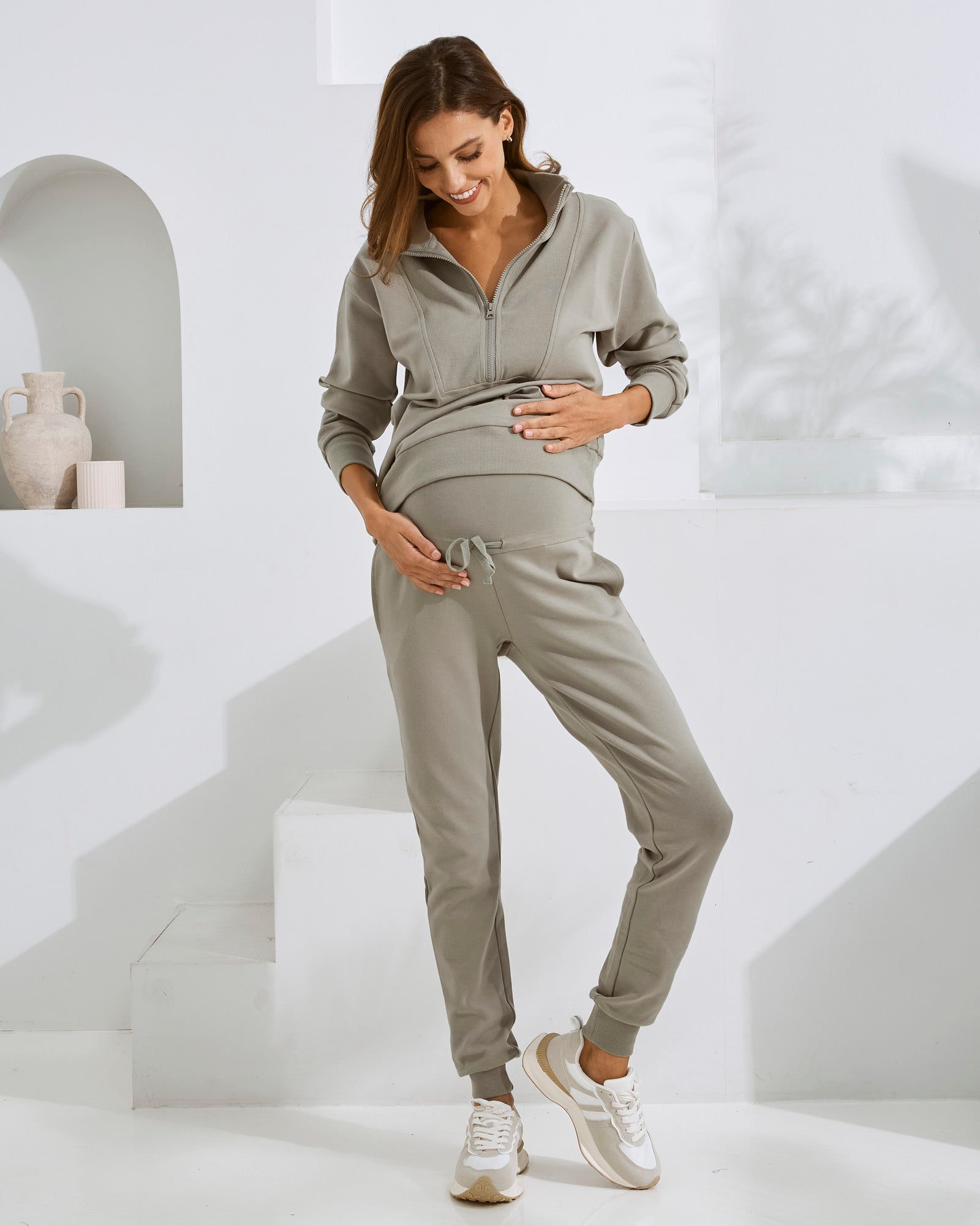 Made in soft and stretchy weighted cotton blend fabric, it's the perfect weight to take you through the seasons. This longline nursing jumper with zip front for easy nursing access that offers a subtle ribbing at the neckline, cuffs and hem . Comes with matching pants with high stretchy waistband for your growing baby bump.