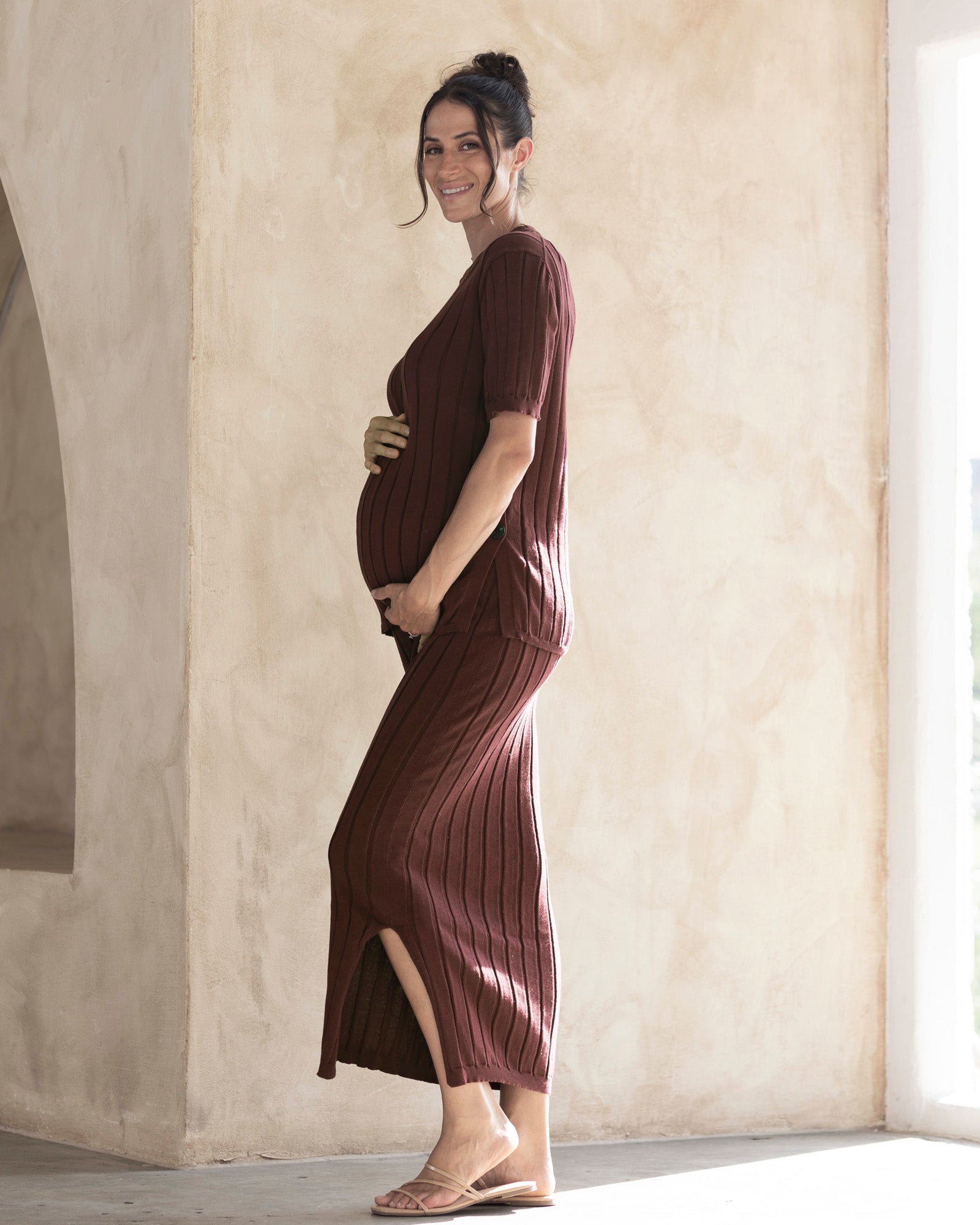 Designed for everyday wear, this wide rib knitted maternity midi skirt offers a sleek straight-line silhouette with extra stretch for ultimate comfort. Wear it high or low on the waist, featuring a stylish side split for ease of movement. Pair it with the matching Alexis top for a coordinated, effortless look.