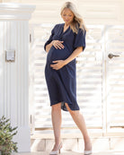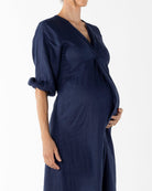 This Twist front maternity work linen dress features a classic V-neck and half sleeves, it offers a perfect blend of style and practicality. The lightweight linen fabric ensures all-day comfort, making it ideal for working moms.