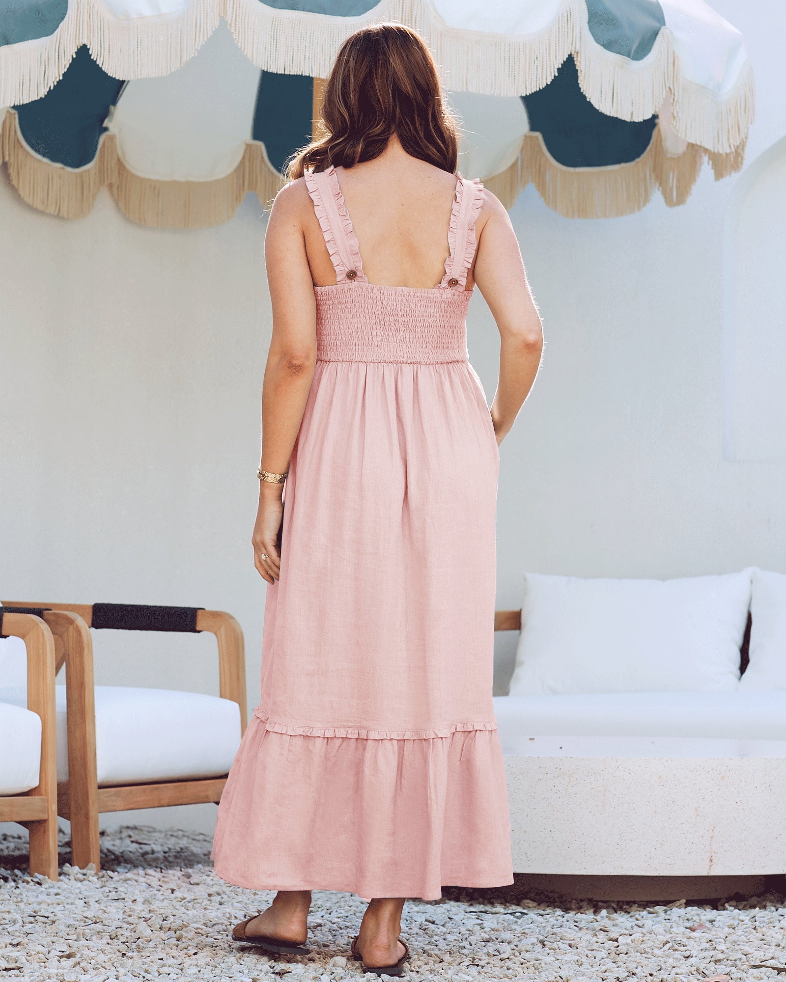 With shirred bodice and empire waist, it creates a flattering silhouette that will accommodate your growing belly. The long, flowing skirt is perfect for keeping you cool and comfortable on hot days, and the side pockets are a convenient place to store your essentials.
