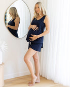 This three-piece set includes a comfortable nursing tank, elastic waistband shorts, and a matching navy stripe baby wrap. Simple yet stylish, it’s perfect for postpartum moms for both lounging and outings.