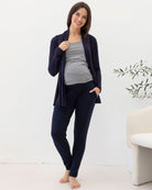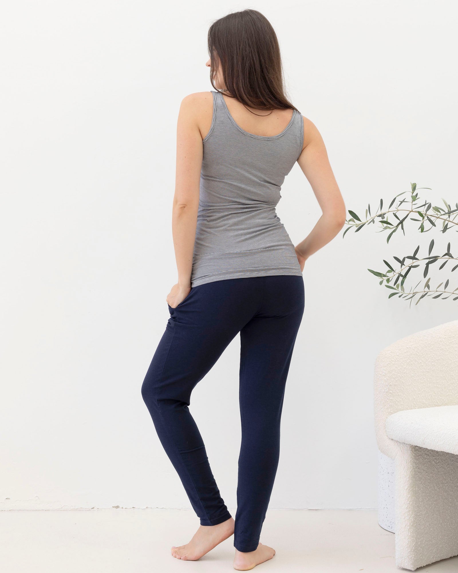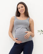 This navy-striped maternity tank top is the perfect combination of comfort, functionality, and timeless style for moms-to-be and nursing moms alike. Crafted from a soft and stretchy bamboo-cotton blend, it adapts beautifully to your growing belly while keeping you cool and comfortable.