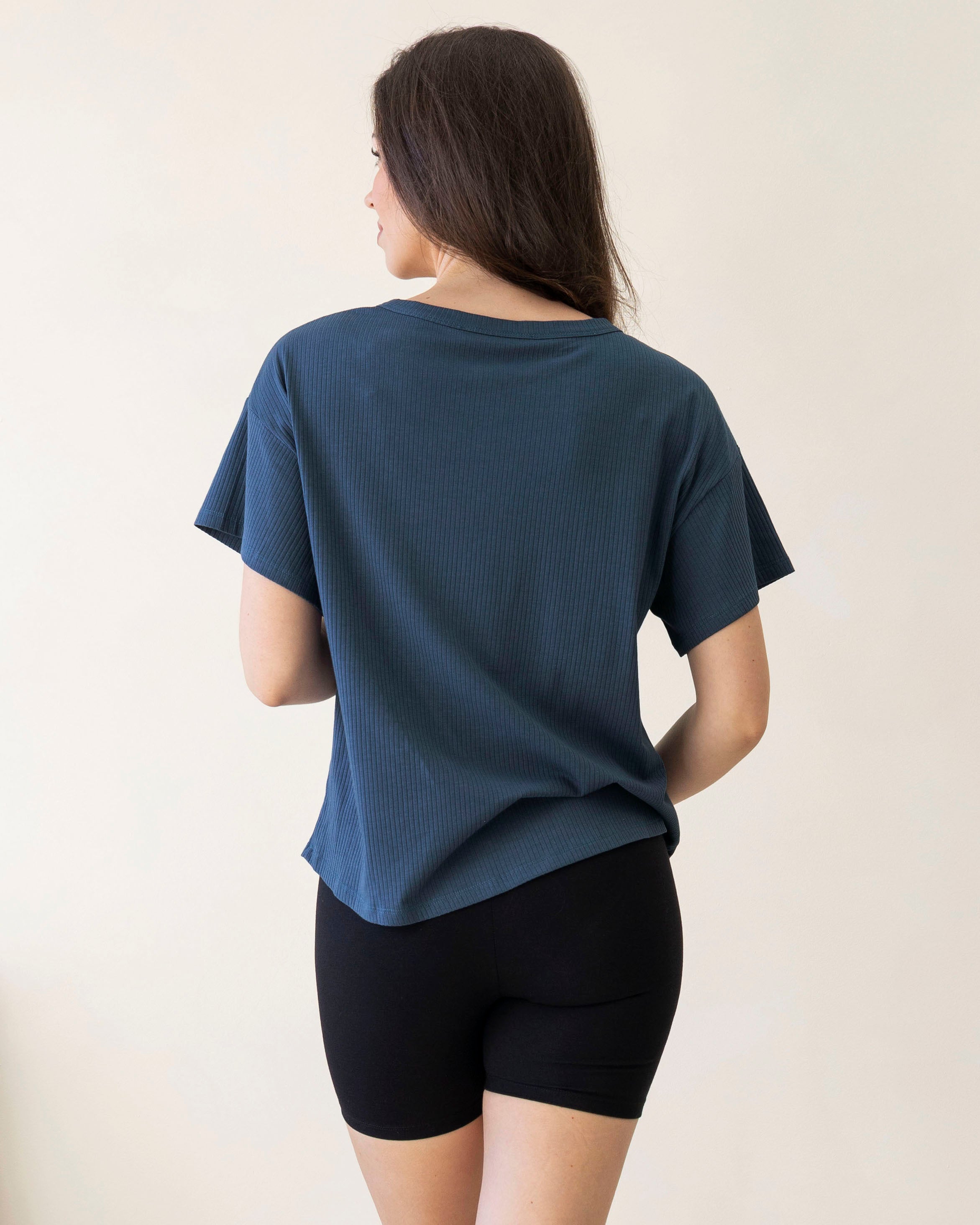 Simple Classic Ribbed Button Short Sleeve Top In Slate Blue.
