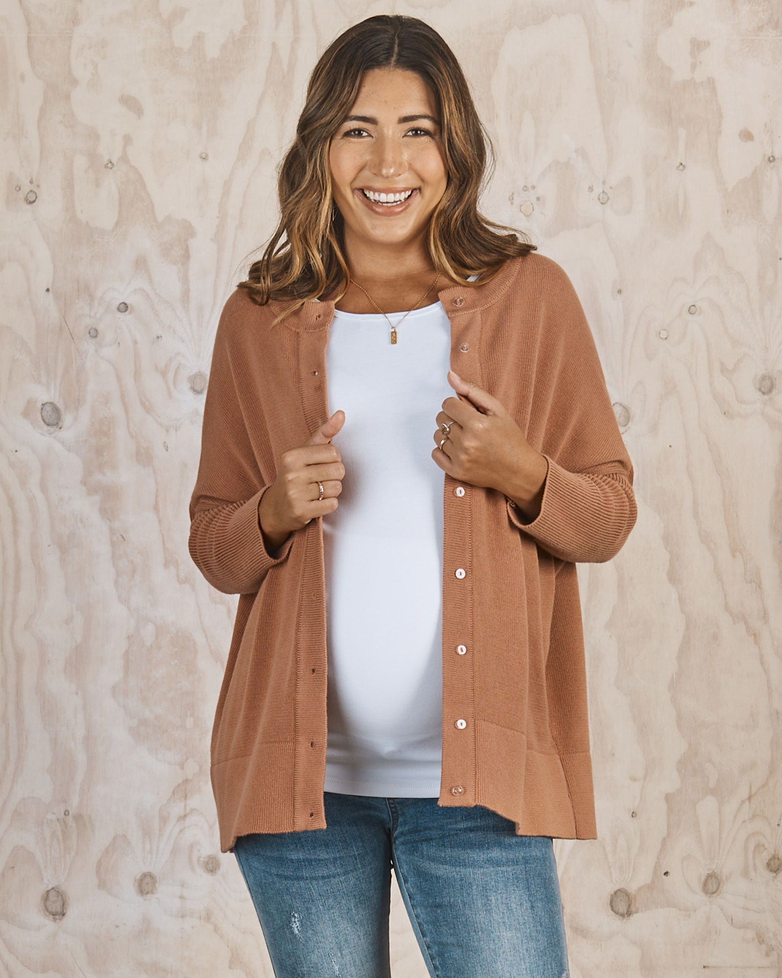 Round neckopen button up cardiganReversible back to frontDesigned to fit through all stages of pregnancy