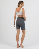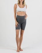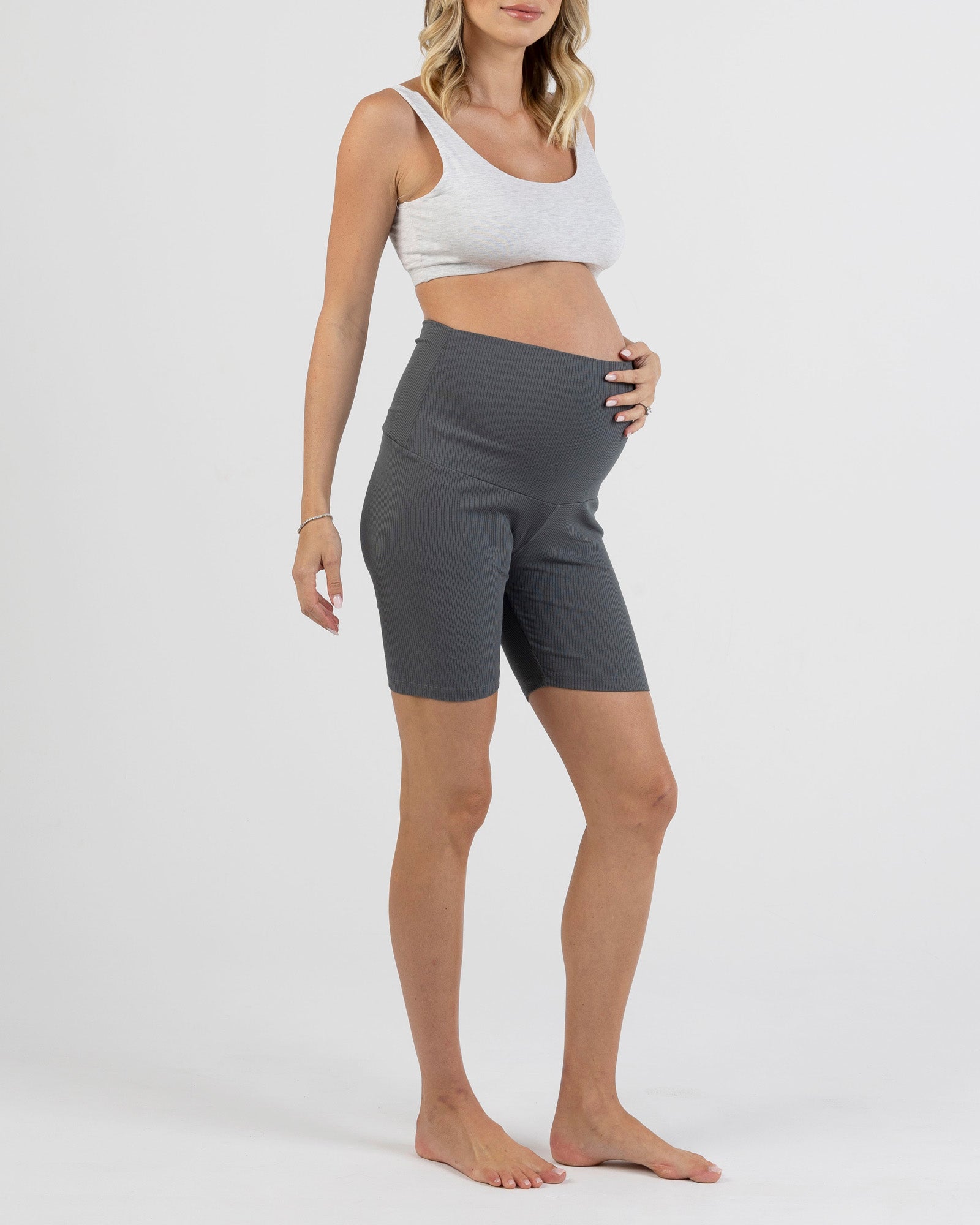 This maternity ribbed bike shorts are made from a stretchy, body-hugging rib fabric, offering simplicity and comfort. The material appears to be a bamboo-blend fabric, which is soft, breathable, and eco-friendly. The high-waisted design provides additional support for the belly, making them ideal for comfortable wear during pregnancy.