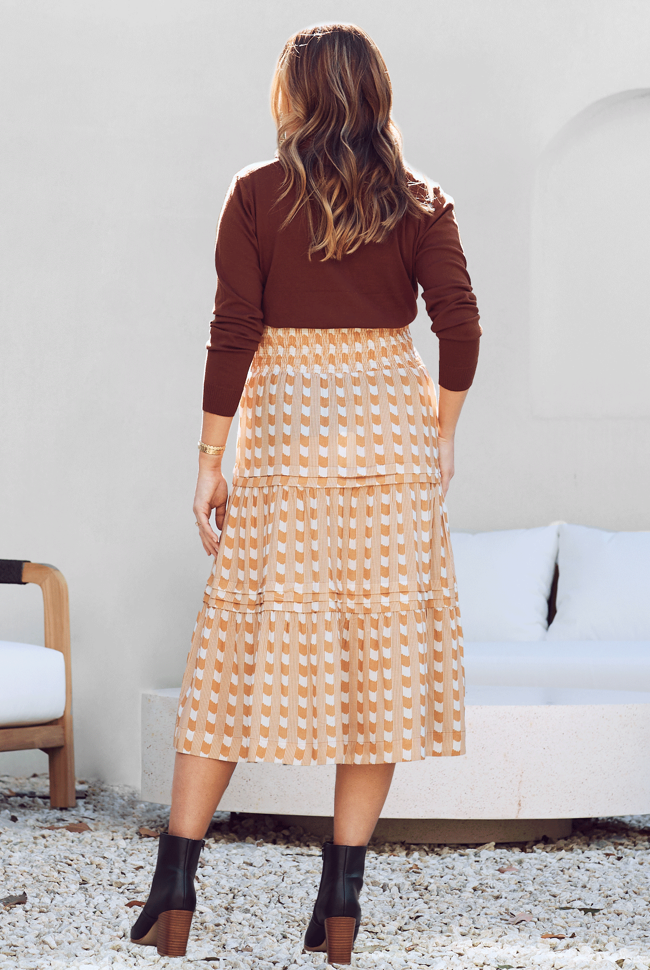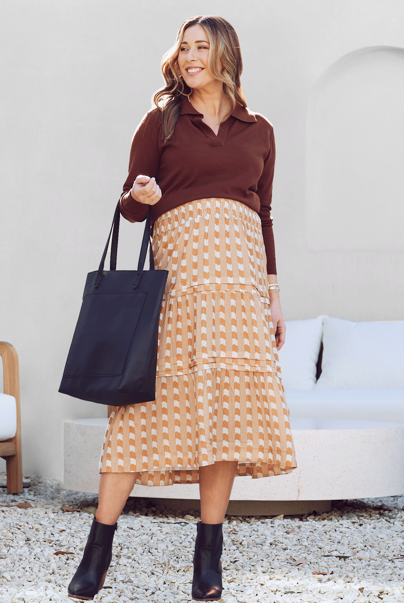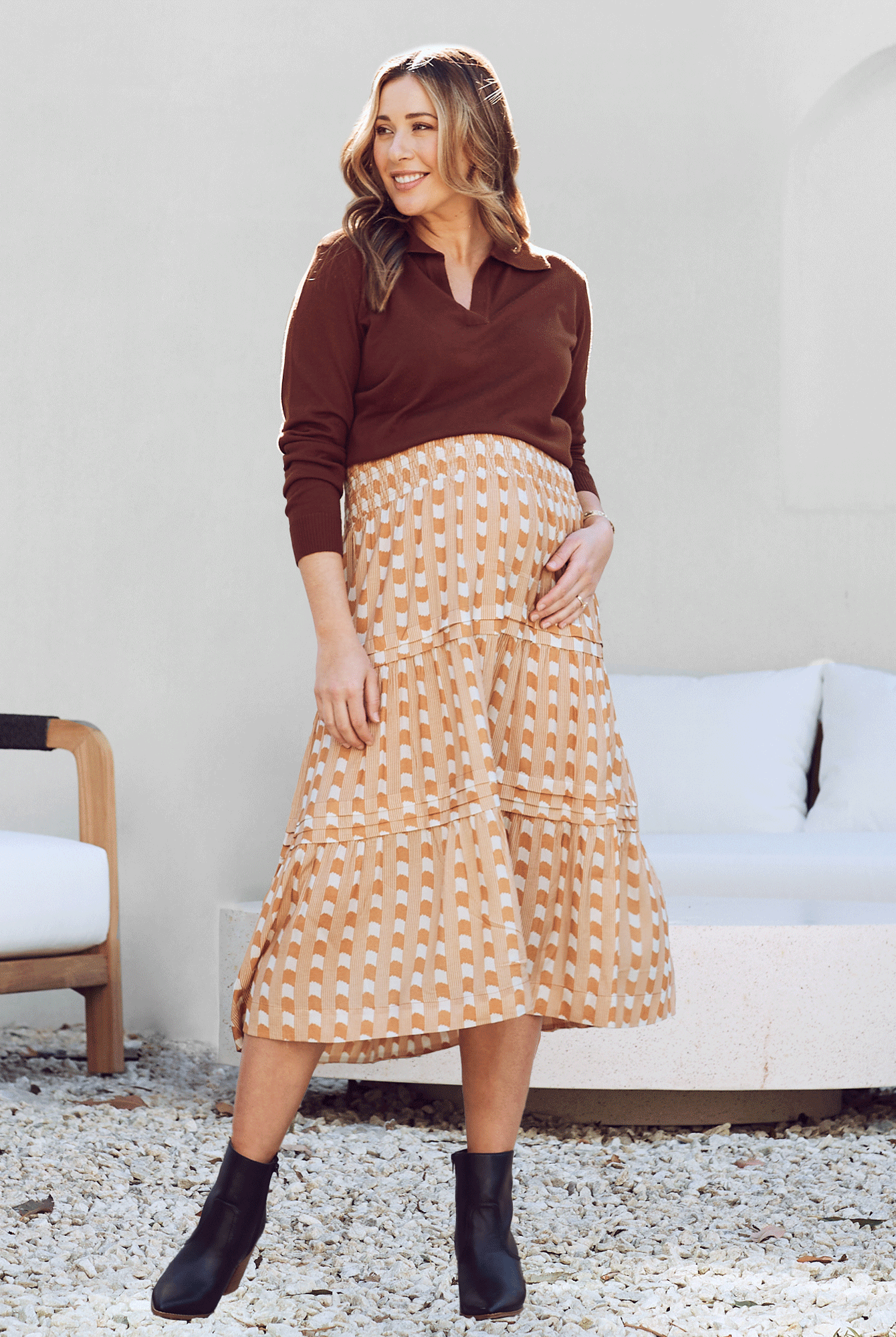 - Midi skirts: These skirts fall below the knee and are a great option for pregnant women who want a comfortable yet stylish look. They can be dressed up or down depending on the occasion.