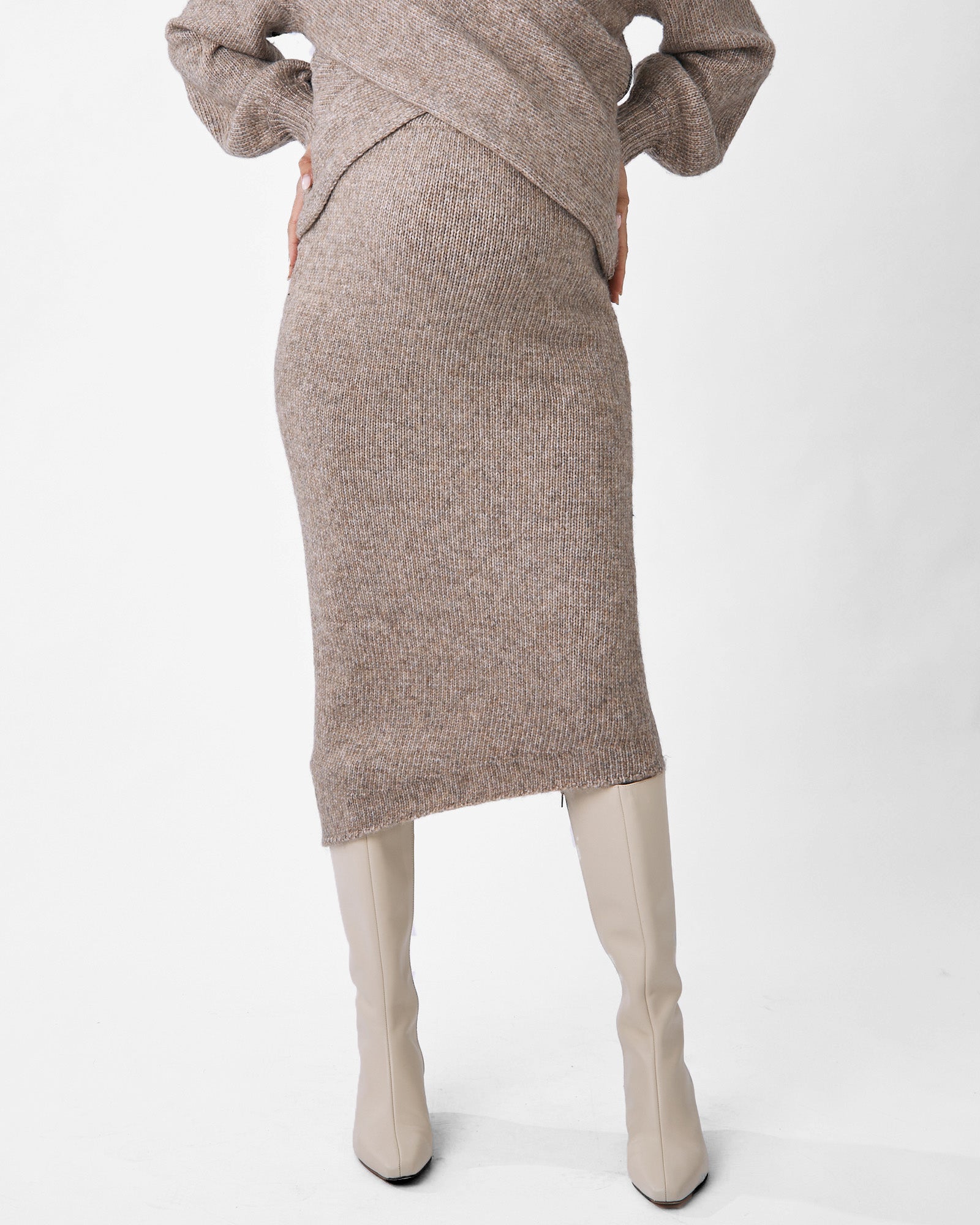 Amélie's Enchanting Allure Asymmetrical Knit Midi Skirt -Taupe
