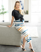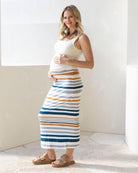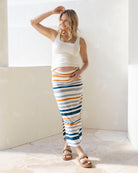 This full-length fitted maternity skirt in multi-colored stripe is designed for extra comfort, and excellent for the growing bump and beyond.