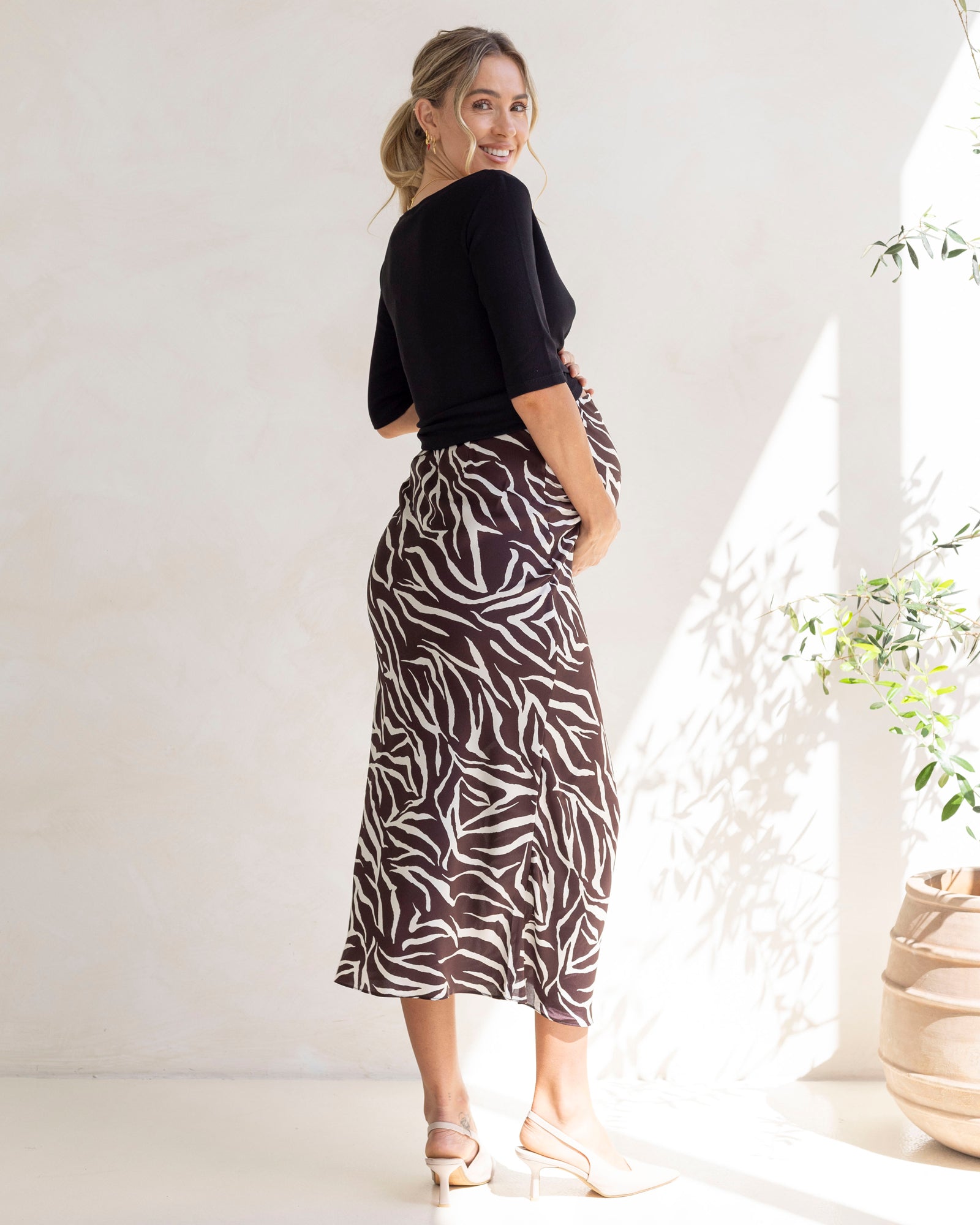 This Satin Finish midi maternity skirt in zebra print is lux piece for any season, from work to dinner. Pair with our Suzie Crossover Top as pictured.