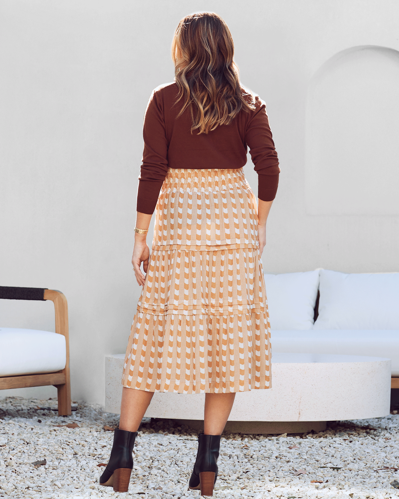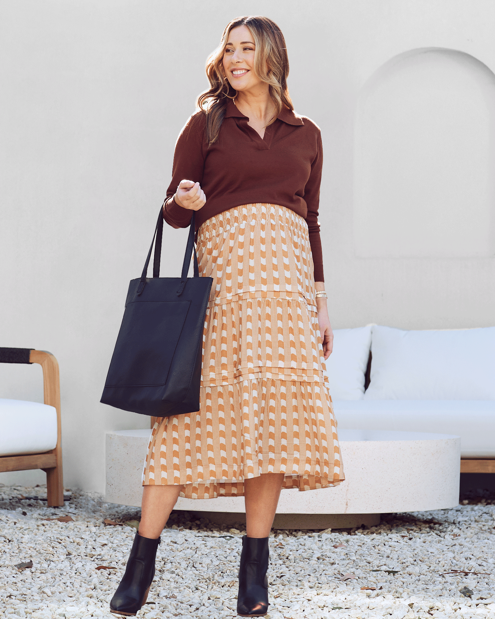 This skirt can be dressed up or down, depending on the occasion. Pair it with a blouse and heels for a formal look, or with a t-shirt and sandals for a more casual look. The camel colour is versatile and goes with just about anything, so you're sure to get a lot of wear out of this skirt.