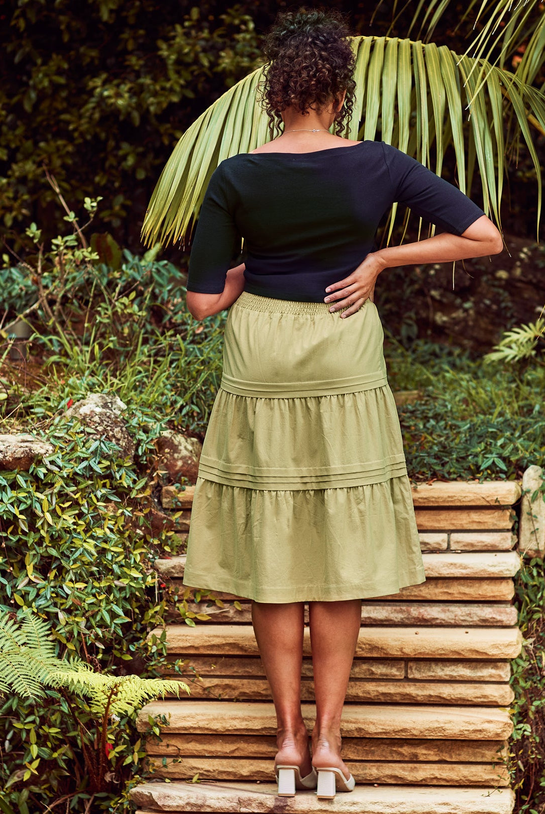 - Midi skirts: These skirts fall below the knee and are a great option for pregnant women who want a comfortable yet stylish look. They can be dressed up or down depending on the occasion.
