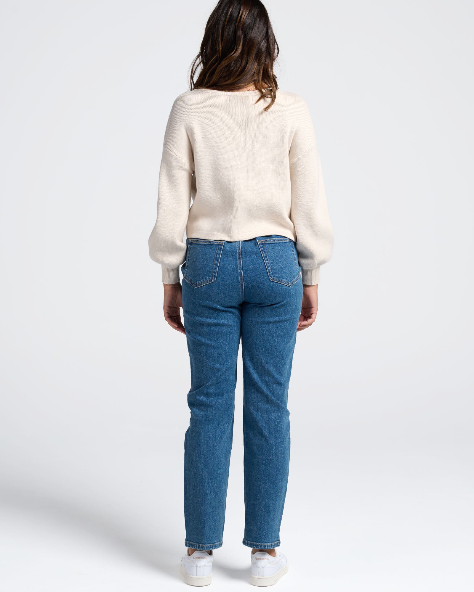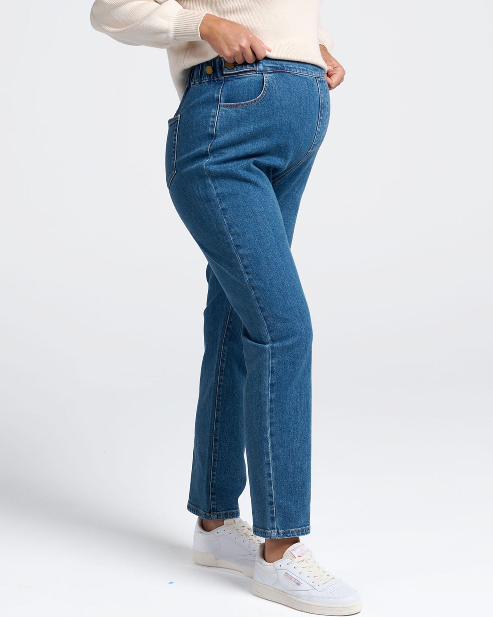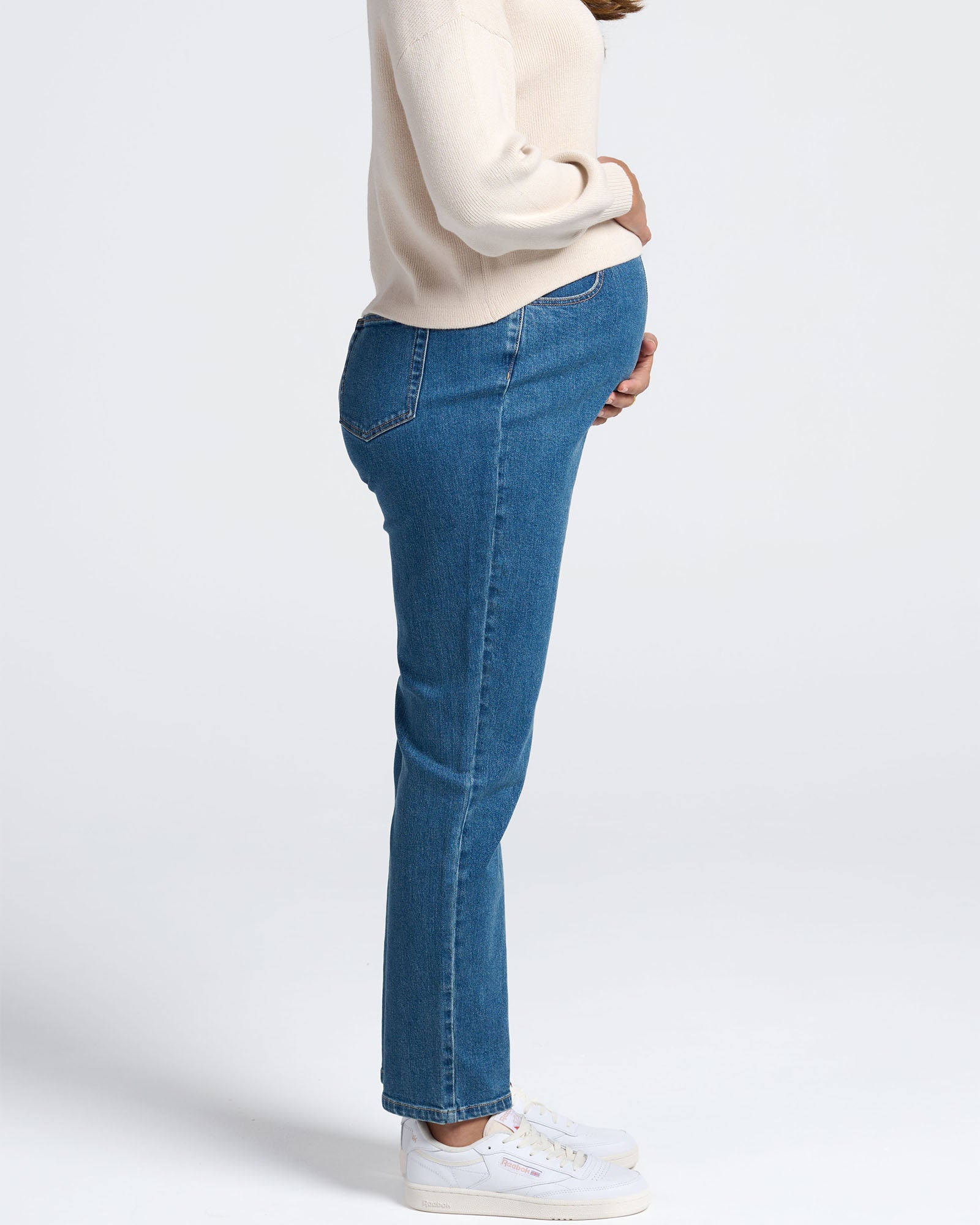 Our most comfortable high waisted maternity blue denim jeans! Cotton-rich denim with generous stretch and a neat waistband with elastic to accommodate your baby bump. Perfect to wear during pregnancy.