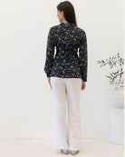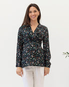 Effortlessly stylish and beautifully practical, this maternity long-sleeve shirt features a flattering V-neckline, front tie detail, and a versatile length designed to comfortably cover your growing bump.