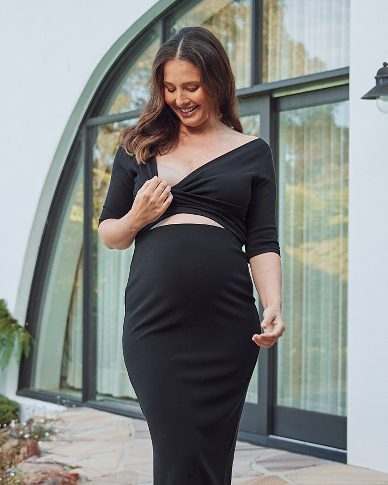 Our new and comfortable maternity top is perfect for everyday wear. The crossover design and off-shoulder neckline are flattering for all body types, and the stretchy fabric ensures a comfortable fit. The top is also perfect for nursing, as the neckline can be easily pulled down to access your breast.
