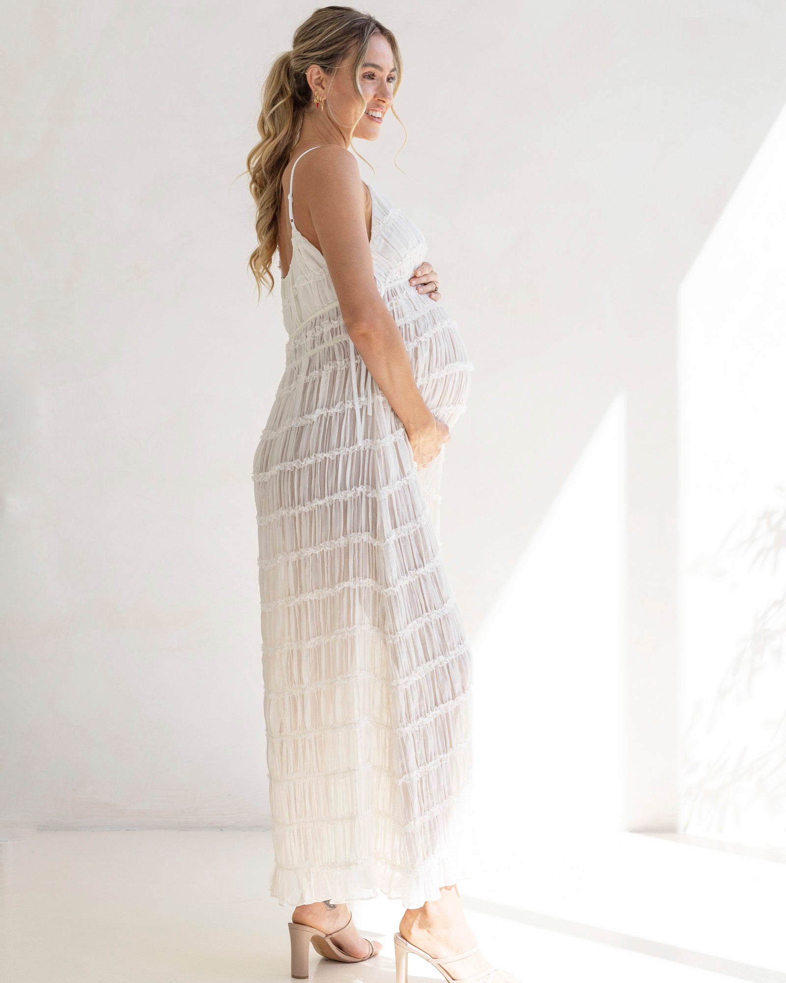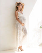 Bask in golden moments and glide into shimmering evenings with the Chloé Sheer Maternity Dress in timeless white. Delicate and romantic, this floaty maxi dress is designed to feel like a second skin — ideal for baby showers, maternity photo shoots, or any glowing celebration.