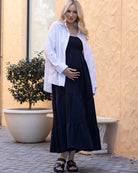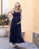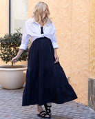 Our Classic Navy Maxi Dress with Tiered Skirt and Smocked Bodice - Perfectly Paired with White Shirt.