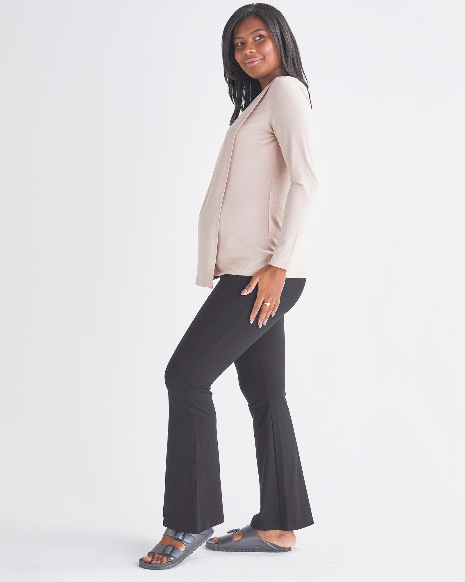 This Blush Pink maternity and nursing tee is made from bamboo cotton, making it soft and breathable for all-day wear. The top features a scoop neck and it is stretchy enough to accommodate your growing belly. It is also perfect for breastfeeding as the has a front panel that can be easily pulled to access your breast.