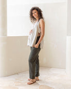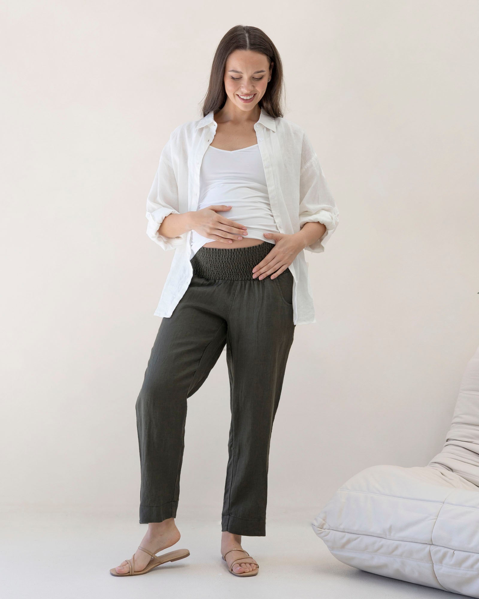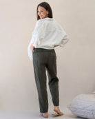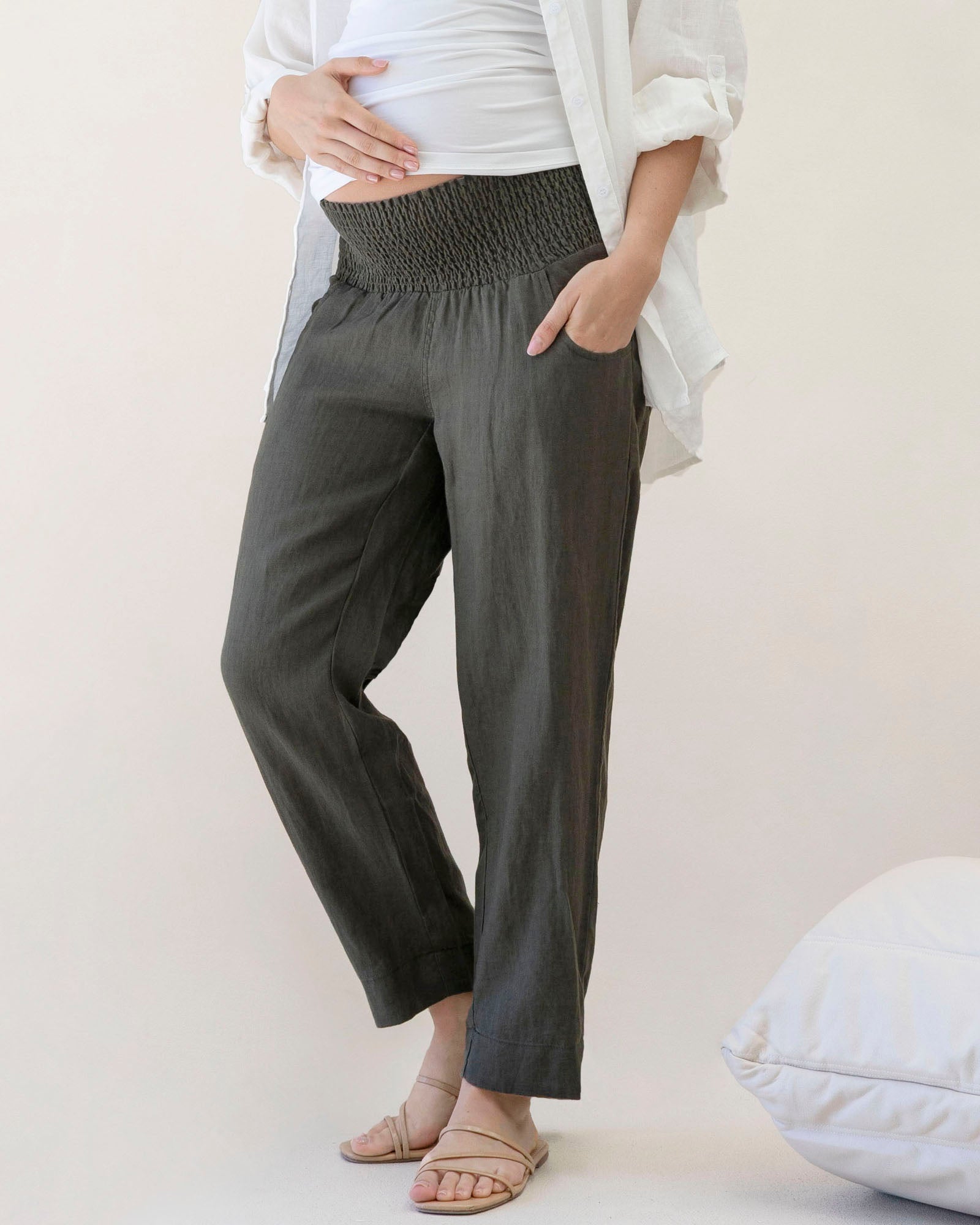 These soft linen maternity pants feature a comfortable ruched waist band and a relaxed and tapered leg. Stylish, soft and comfortable, you will enjoy wearing them during your pregnancy. Pair with our matching linen top to complete the look.