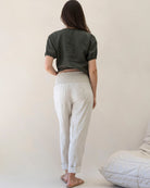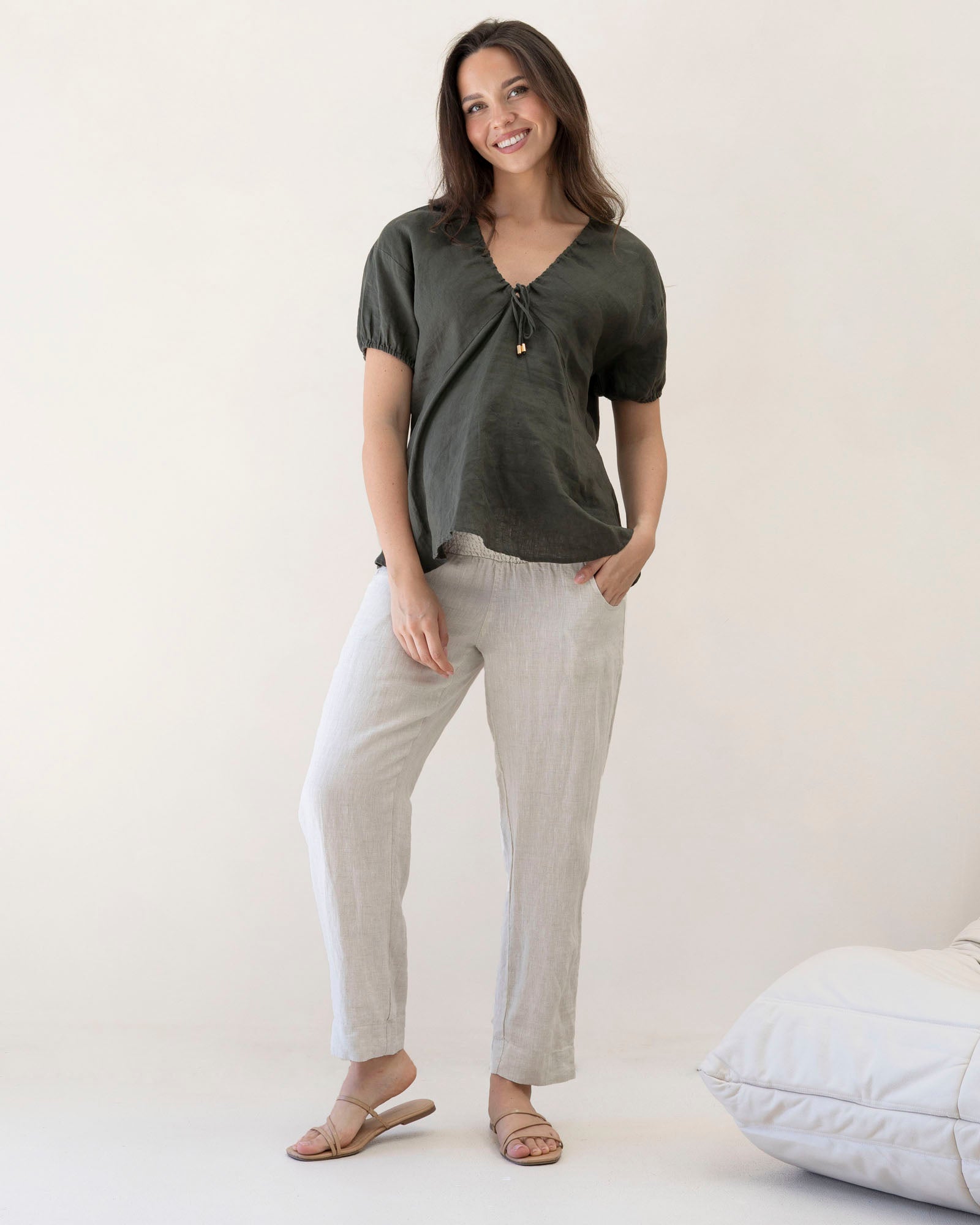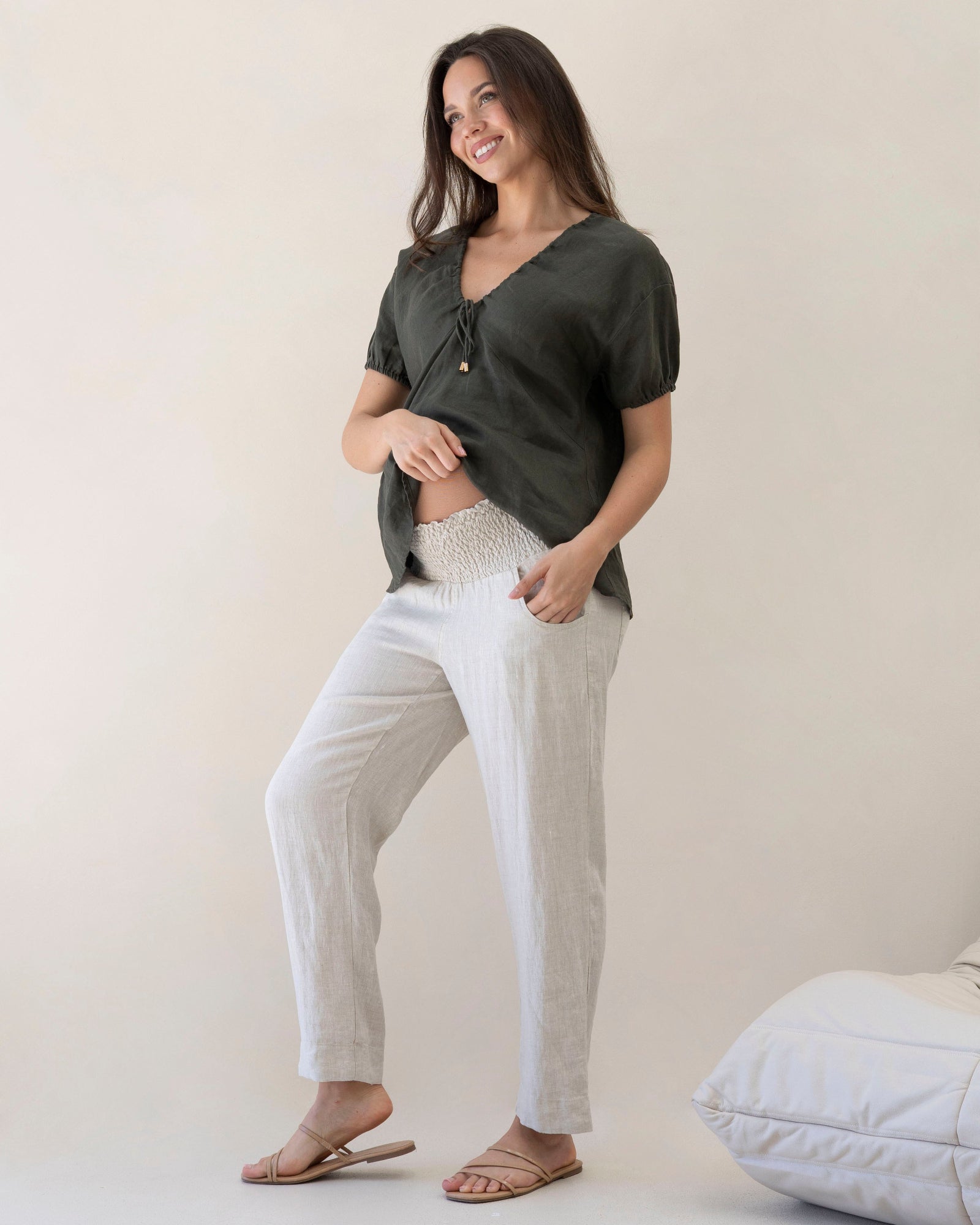 These soft linen maternity pants feature a comfortable ruched waist band and a relaxed and tapered leg. Stylish, soft and comfortable, you will enjoy wearing them during your pregnancy. Pair with our matching linen top to complete the look.