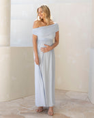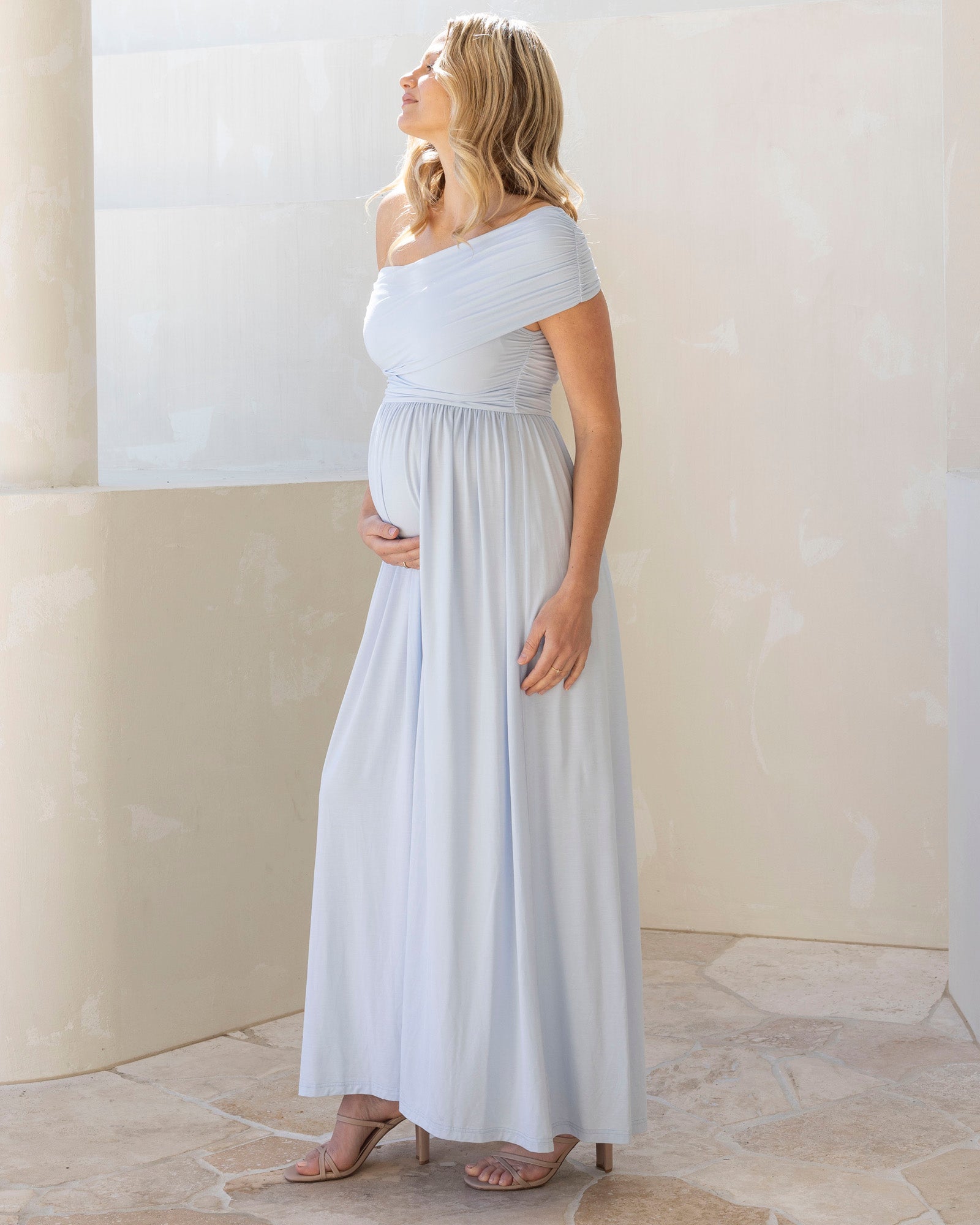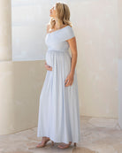 Turn heads at your baby shower or babymoon with this elegant off-shoulder maternity maxi dress. Designed in a versatile one-shoulder or off-shoulder style, the fitted bodice highlights your shape while the soft gathering from the waistline flows into a subtle baby doll silhouette.