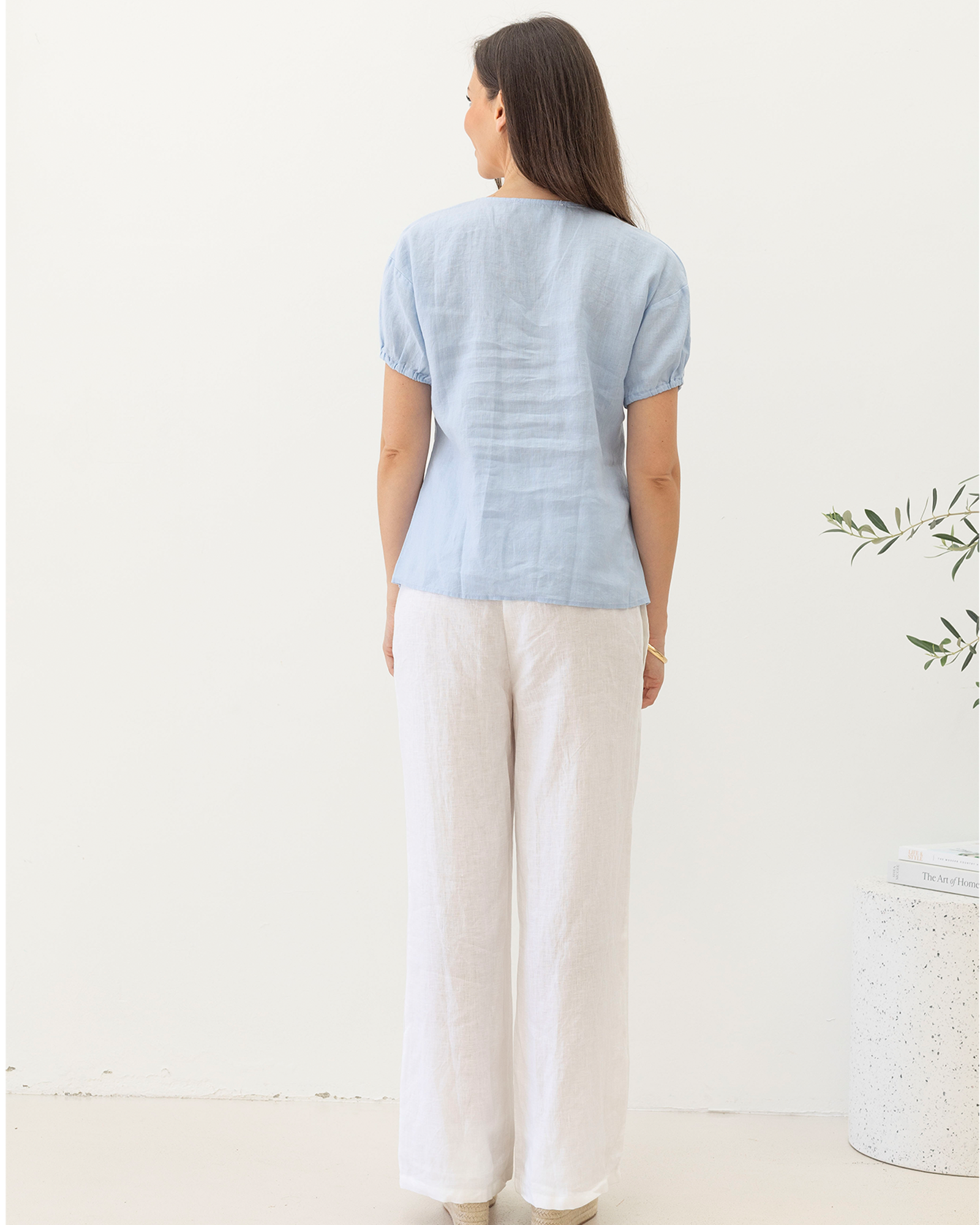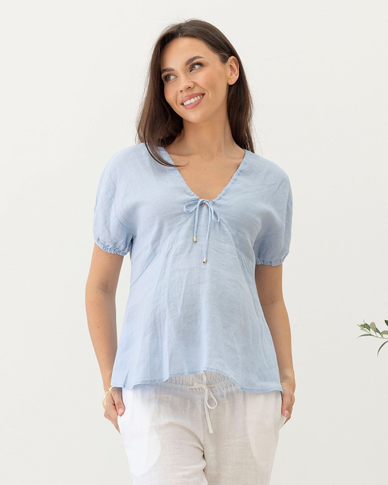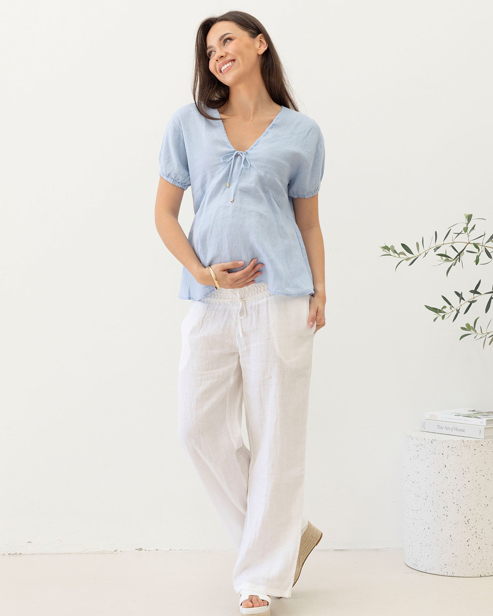 This soft washed linen maternity top is designed to drape elegantly, allowing plenty of room for growing pregnancy bump.