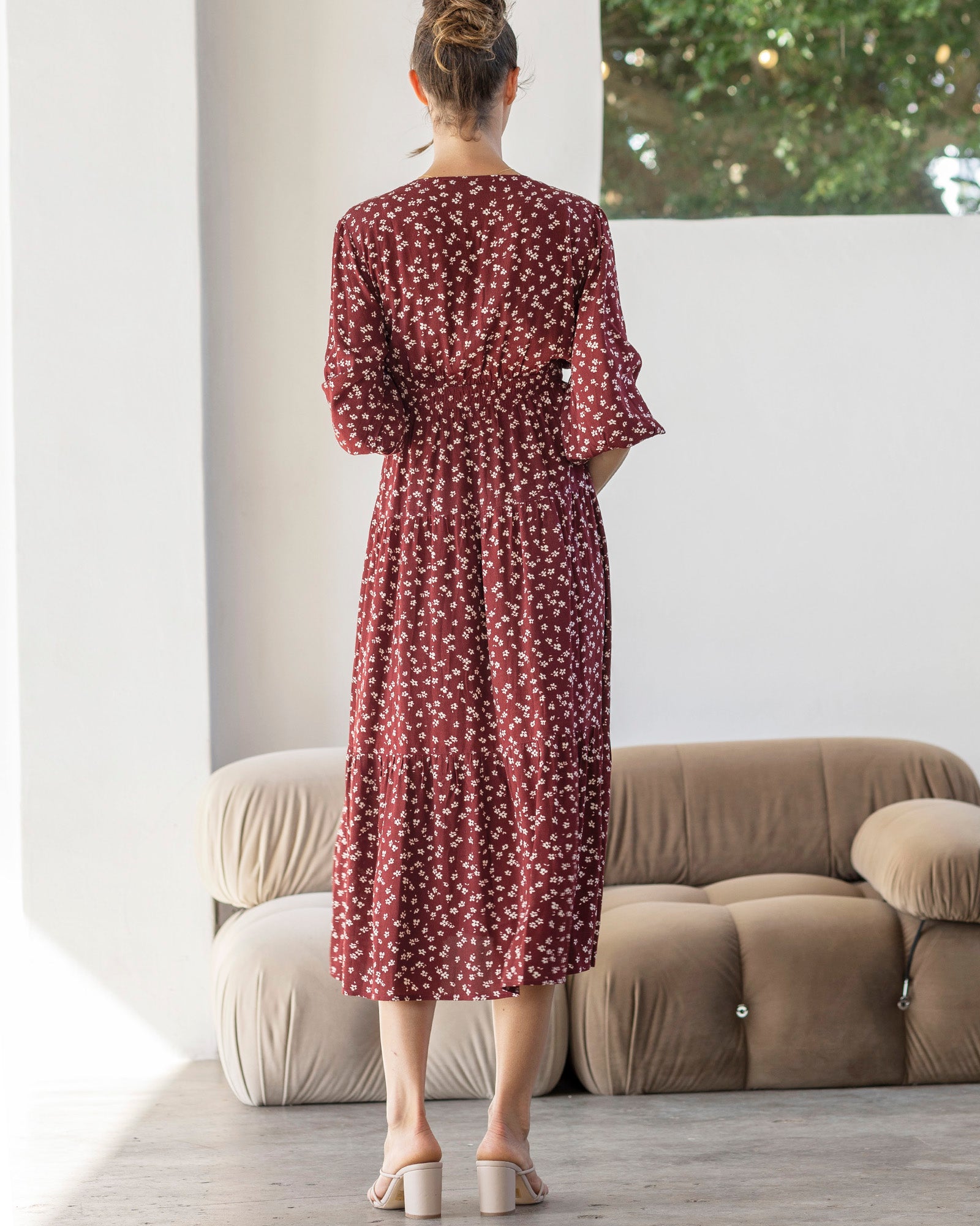 Make a statement in this stunning black leaf print dress, designed for both comfort and elegance. Featuring a flattering crossover V-neckline and an elasticized waistband, this dress enhances your silhouette while offering a relaxed fit. The tiered, gathered skirt adds movement and charm, making it perfect for any occasion.