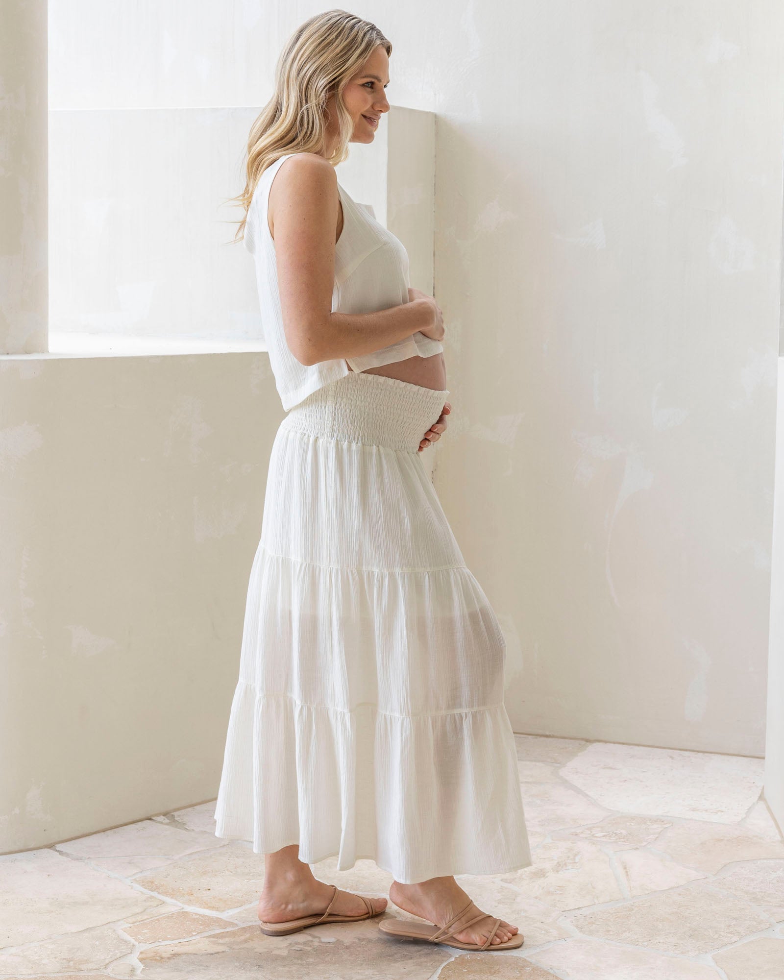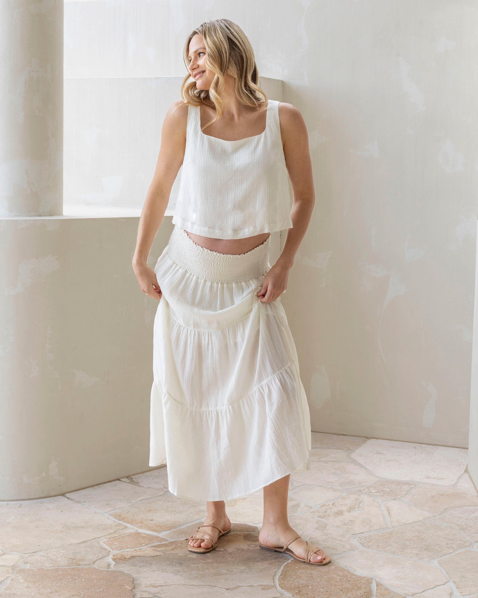 Elevate your maternity wardrobe with this stylish cropped maternity tank top, designed for effortless pairing and timeless appeal. The delicate natural-blend fabric drapes beautifully, while the feminine details make it a versatile piece you’ll wear again and again. Perfect with skirts, trousers, or layered over dresses, it adds a touch of understated elegance to any outfit.