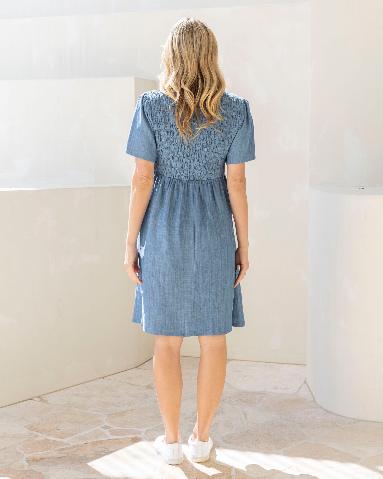 Effortlessly chic and comfortable, this maternity denim dress is designed for your everyday wear. Featuring a soft smocked bodice, short sleeves, and a flattering knee-length cut, it’s made from a breathable light-wash denim that feels beautifully soft on the skin. Side pockets add a practical touch for mums on the go.